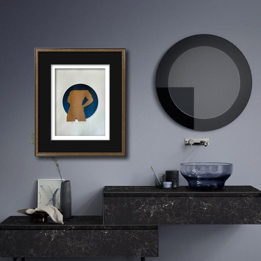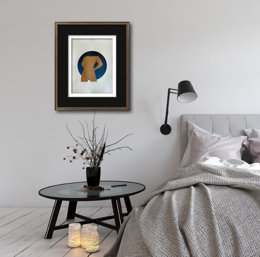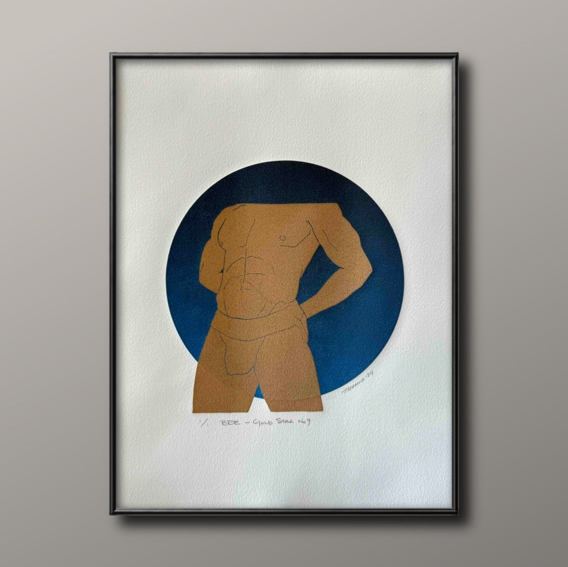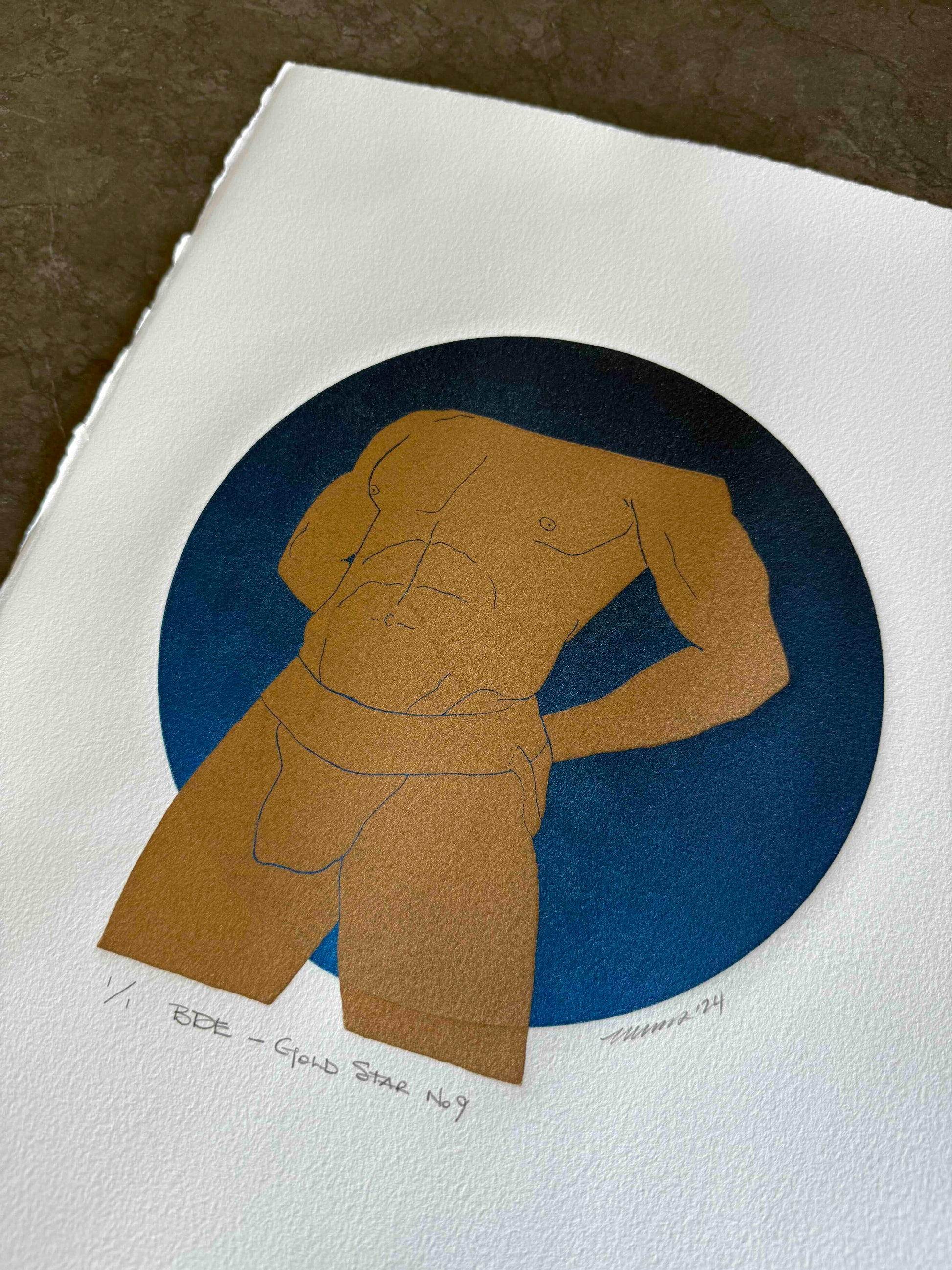 “BDE - Gold Star No. 9” Golden Linocut Male Torso on Cobalt-Navy Ombre circle. One-of-a-kind piece, signed as "1/1" — ‘one of one’.
