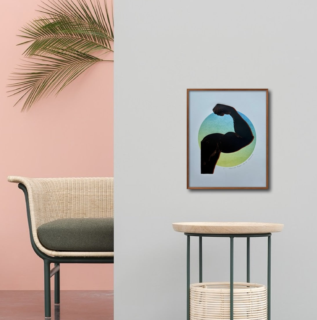 Three-layer print with black bicep overlayed on a dark red bicep base, on top of a muted blue-to-lime green ombre circle. White paper. One-of-a-kind piece, signed as "1/1" — ‘one of one’.