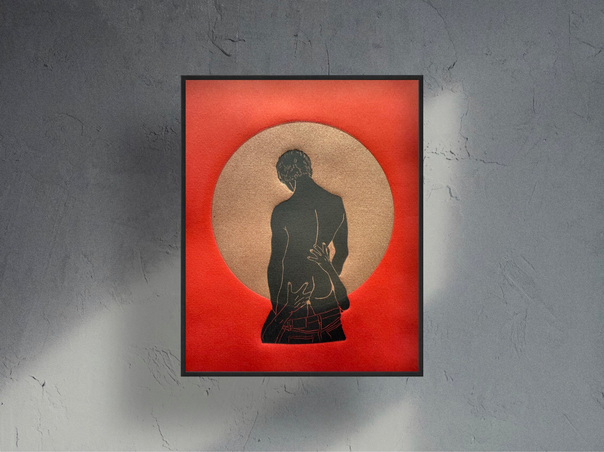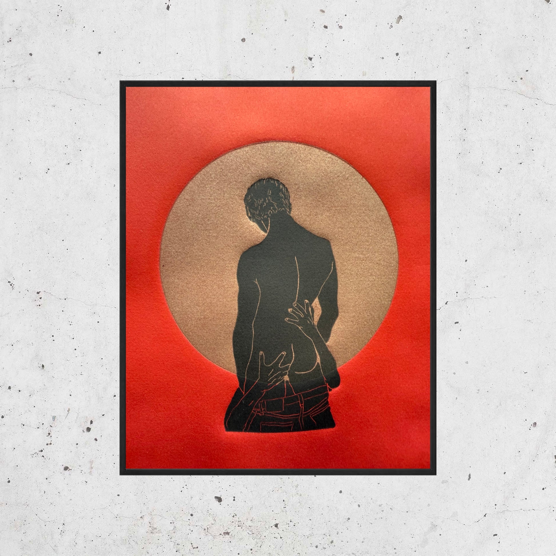 "Boys Will Be Boys - No 3". Black Figures on Gold Circle. Fully Saturated, Red Background.