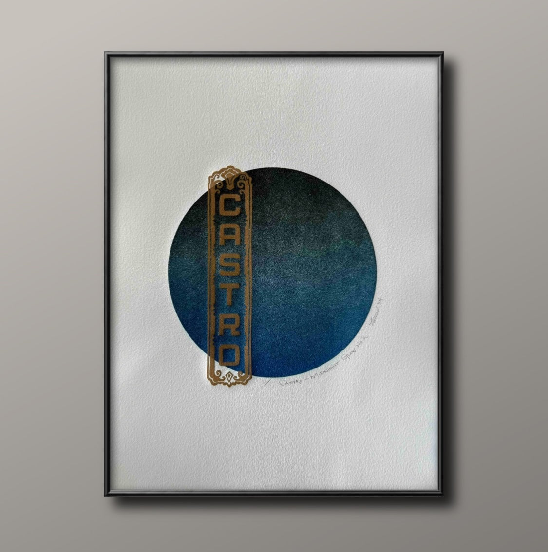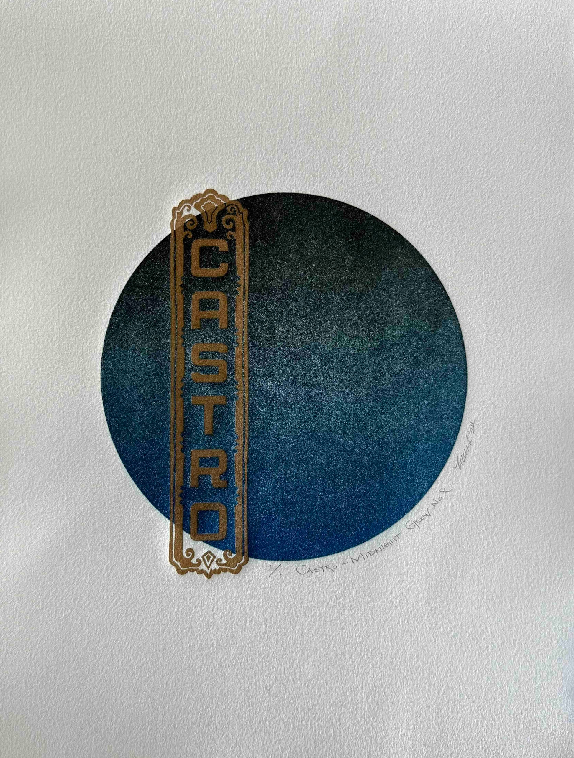 Each piece is hand-printed on an analog printing press with oil-based inks on archival paper. The circle is printed first with a “rainbow roll” on a monotype plate. The linocut Castro sign is then printed as an overlay to the circle. The process creates a beautiful embossment of both the sign, and the circle.