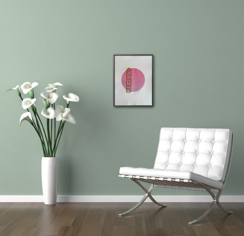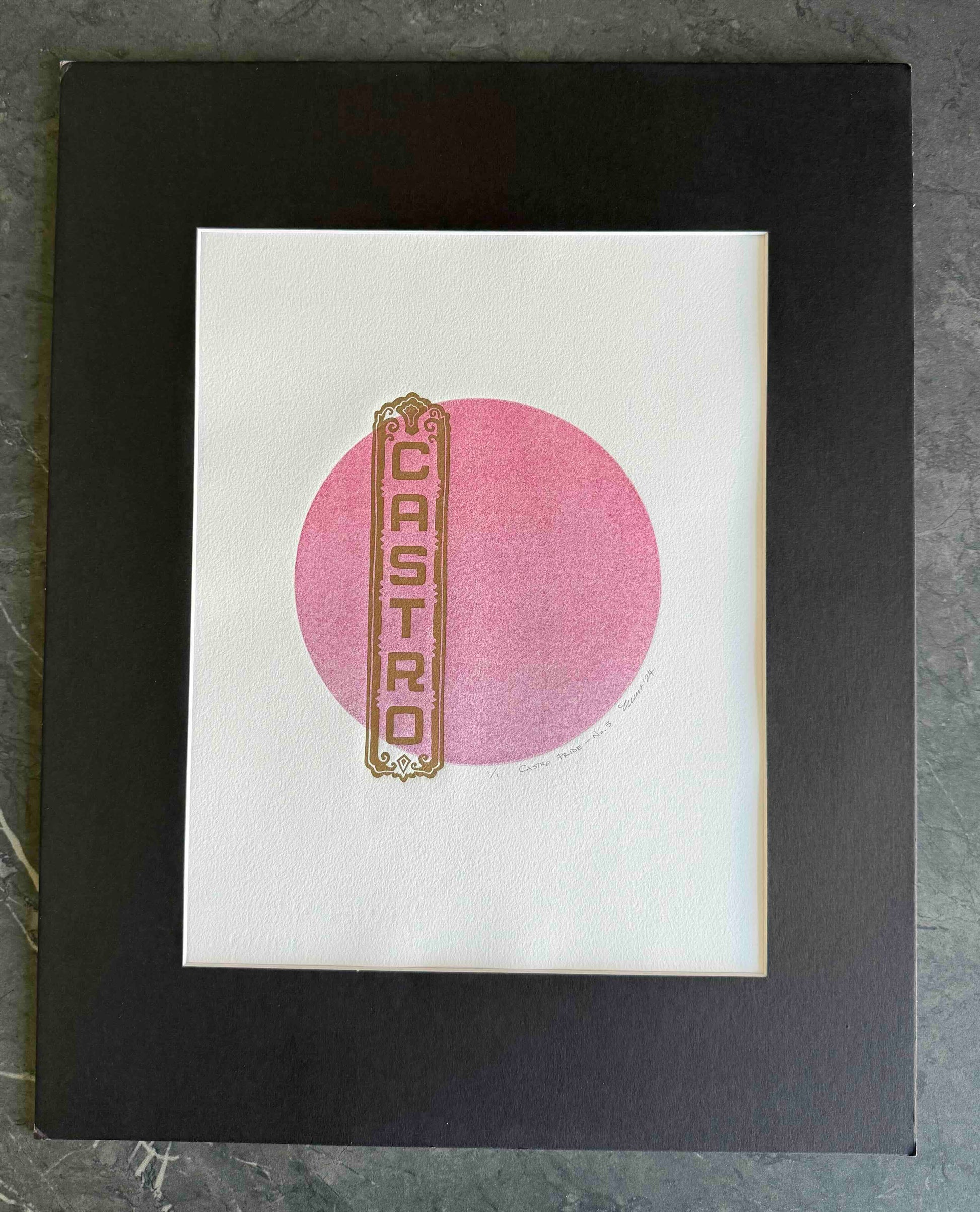 Each piece is hand-printed on an analog printing press with oil-based inks on archival paper. The circle is printed first with a “rainbow roll” on a monotype plate. The linocut Castro sign is then printed as an overlay to the circle. The process creates a beautiful embossment of both the sign, and the circle.