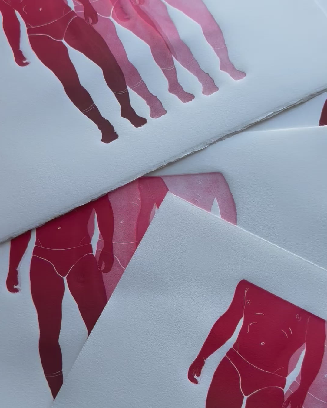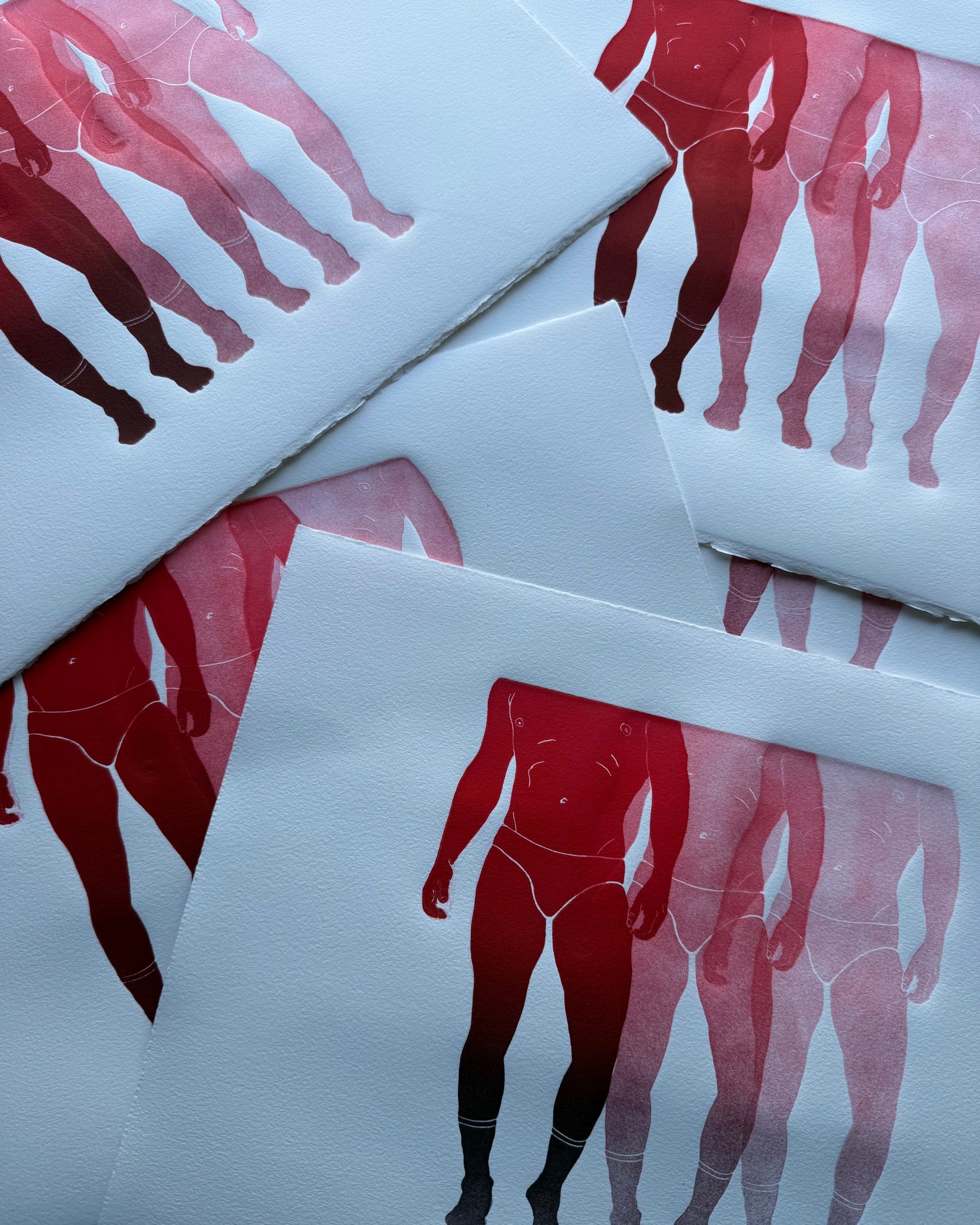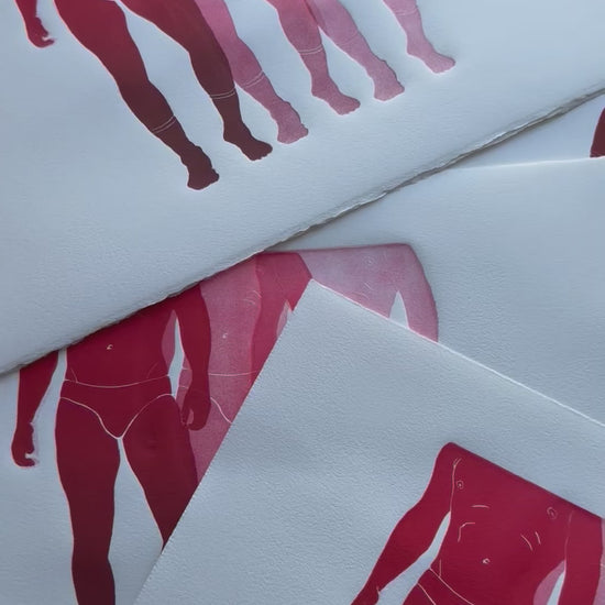 Limited Edition Linocut. Three-layer loose print with repeating figures in red “rainbow roll”. White paper.
