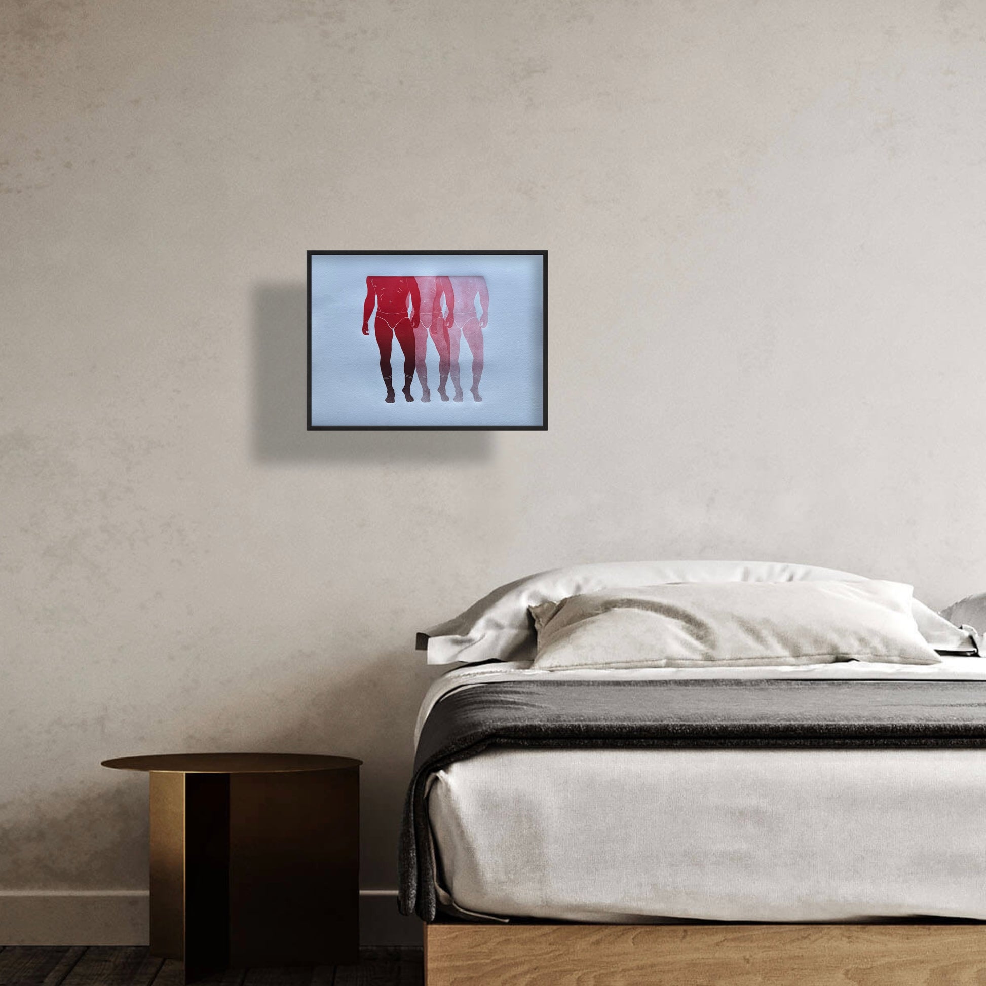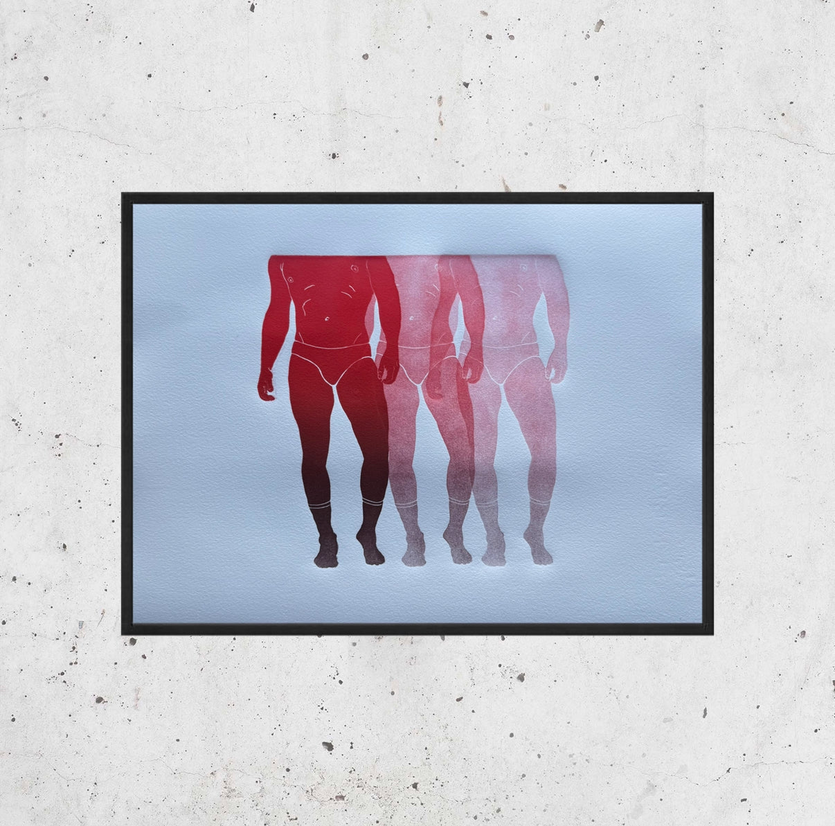 Each art piece is hand-printed on an analog printing press with oil-based inks on archival paper. The figure is created from a carved linocut ‘plate’ that is then printed multiple times, without re-inking. The process is called, “ghosting".