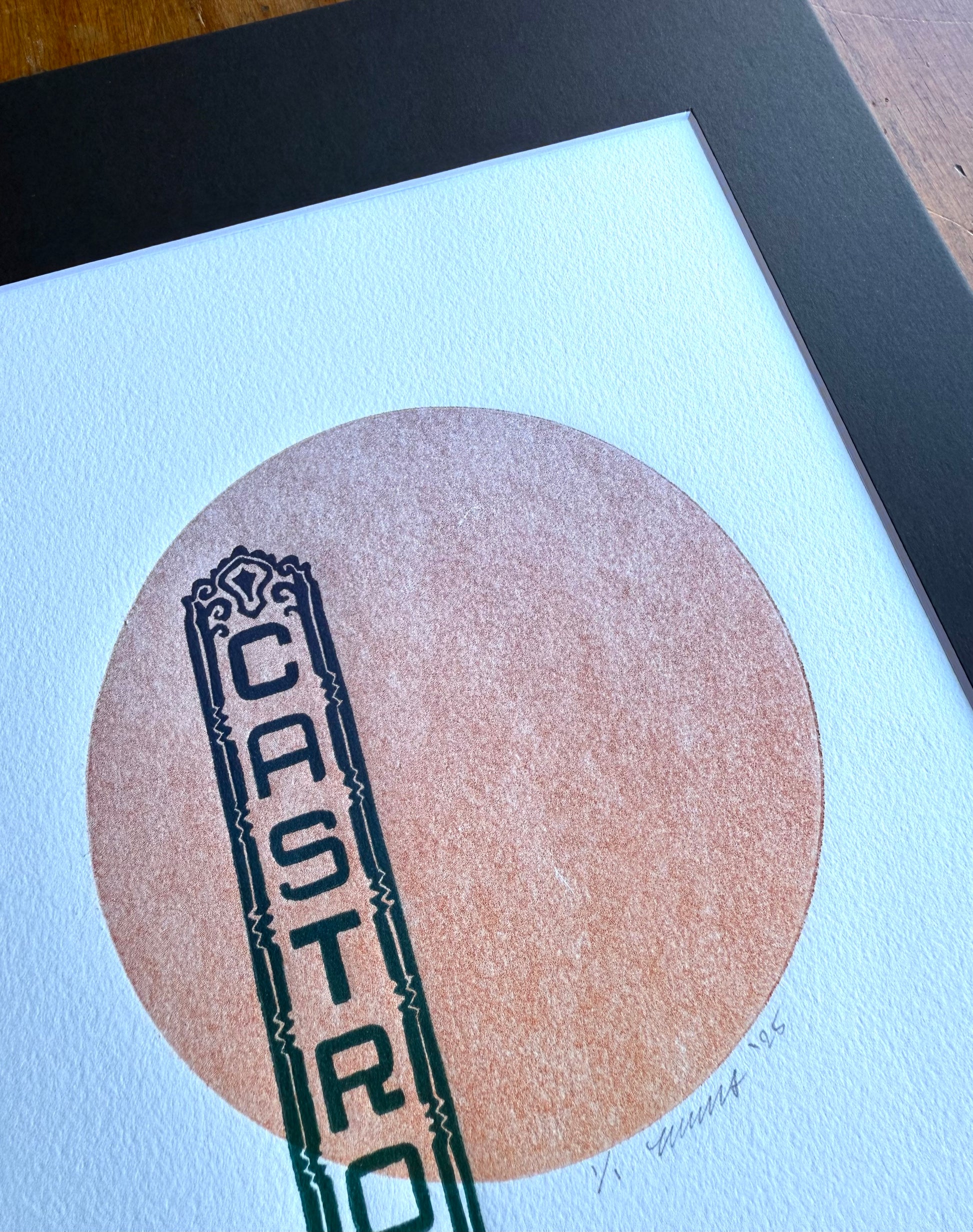 Matted, two-layer print. Dark Teal/Navy linocut Castro Theatre sign overlayed on an orange/red ombre circle. One-of-a-kind piece, signed as "1/1" — ‘one of one’.