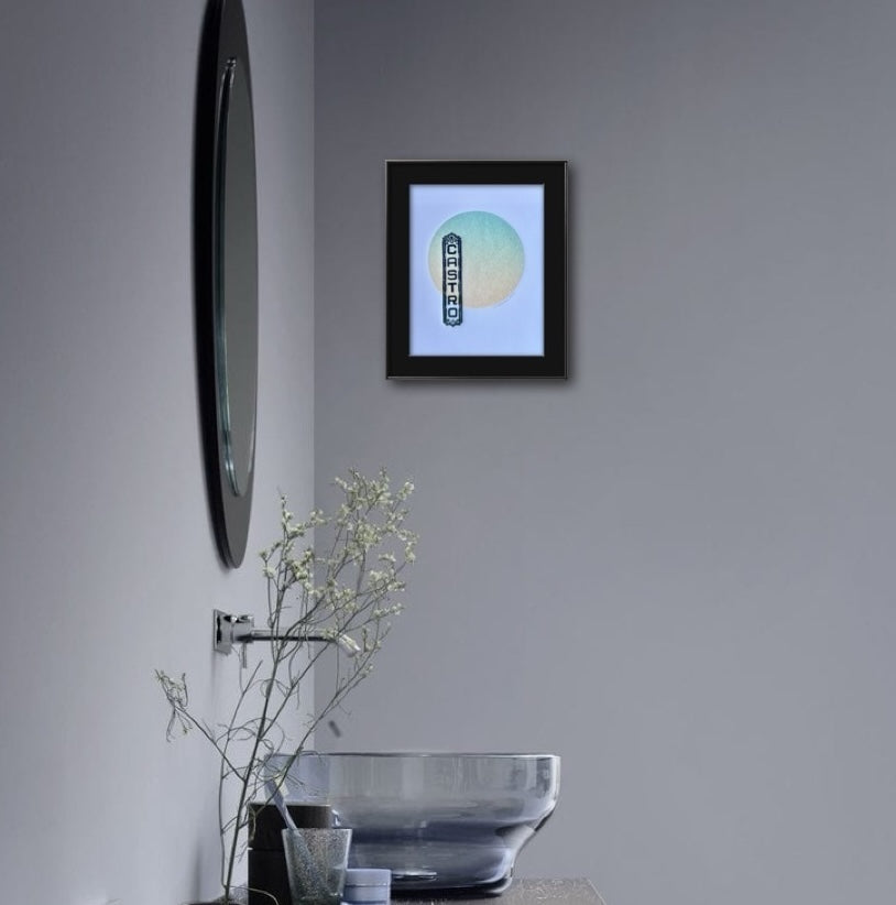 Dark Blue Castro Sign. Yellow/Teal Circle. 8x10 Art in 11x14 Mat.
