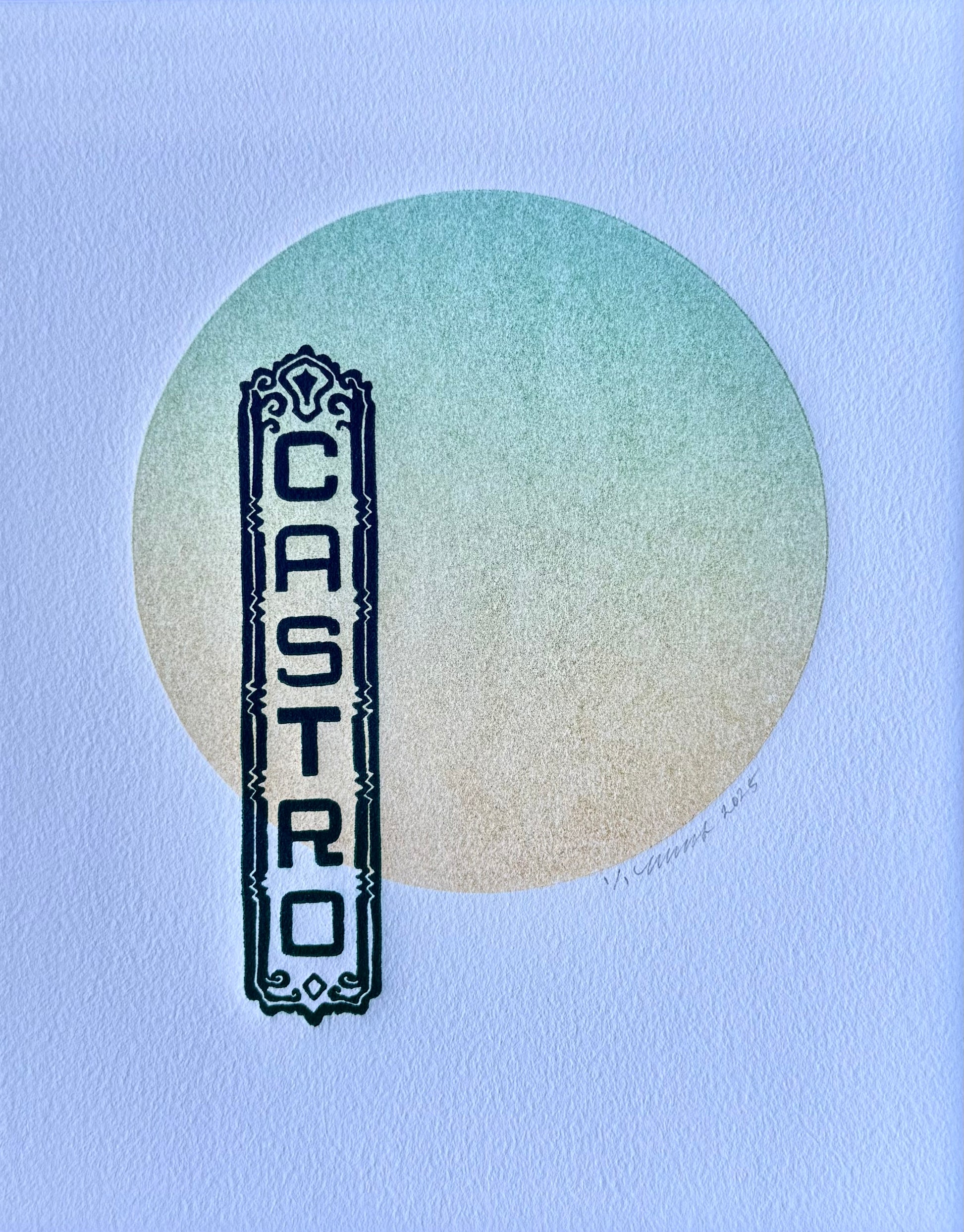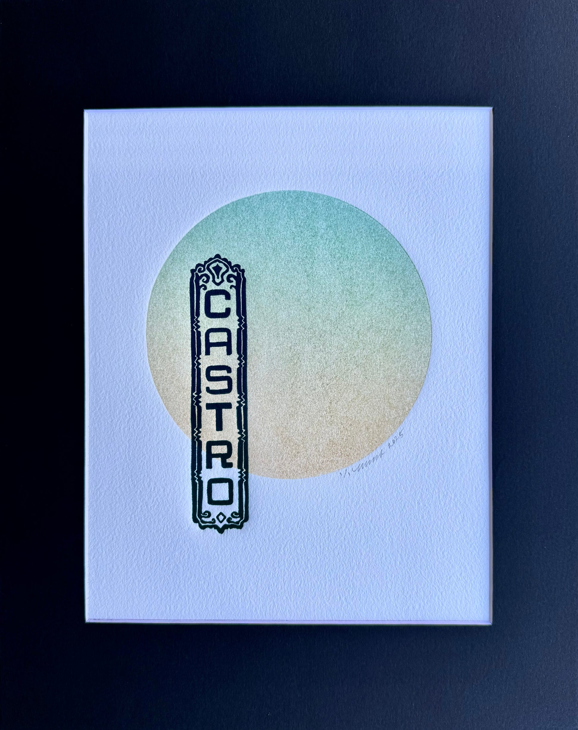 Each piece is hand-printed on an analog printing press with oil-based inks on archival paper. The circle layer is printed first with a “rainbow roll” using a monotype plate. The linocut Castro Theatre sign is then printed as an overlay to the circle, in this case with a dark teal/navy ombre “rainbow roll”. The process creates a beautiful embossment of both the figure, and the circle.