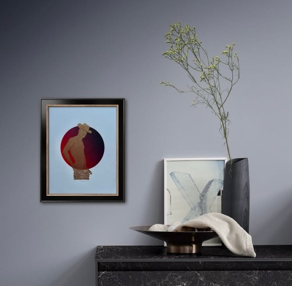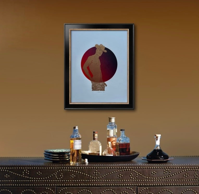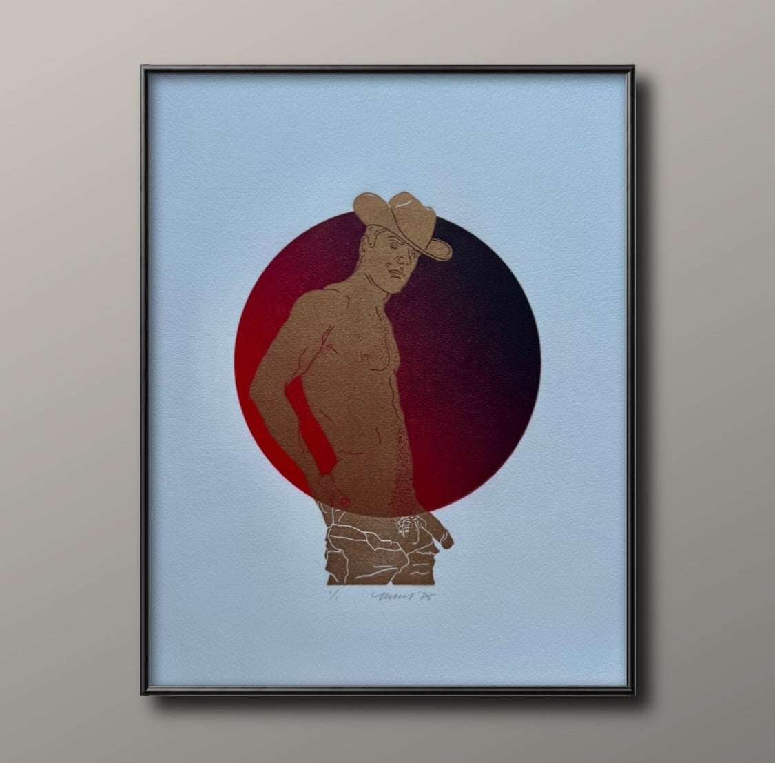 Two-layer loose print with a gold linocut cowboy overlayed on a rich red-to-black ombre circle. One-of-a-kind piece, signed as "1/1" — ‘one of one’.