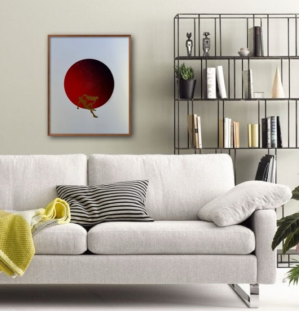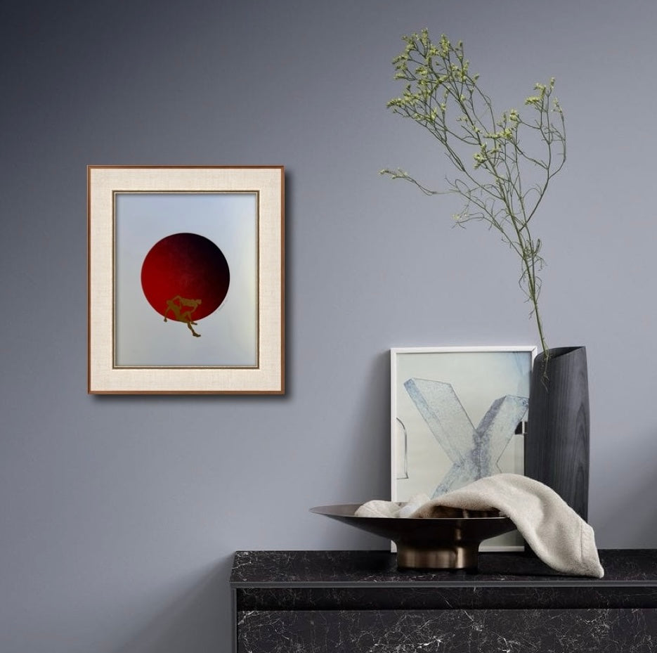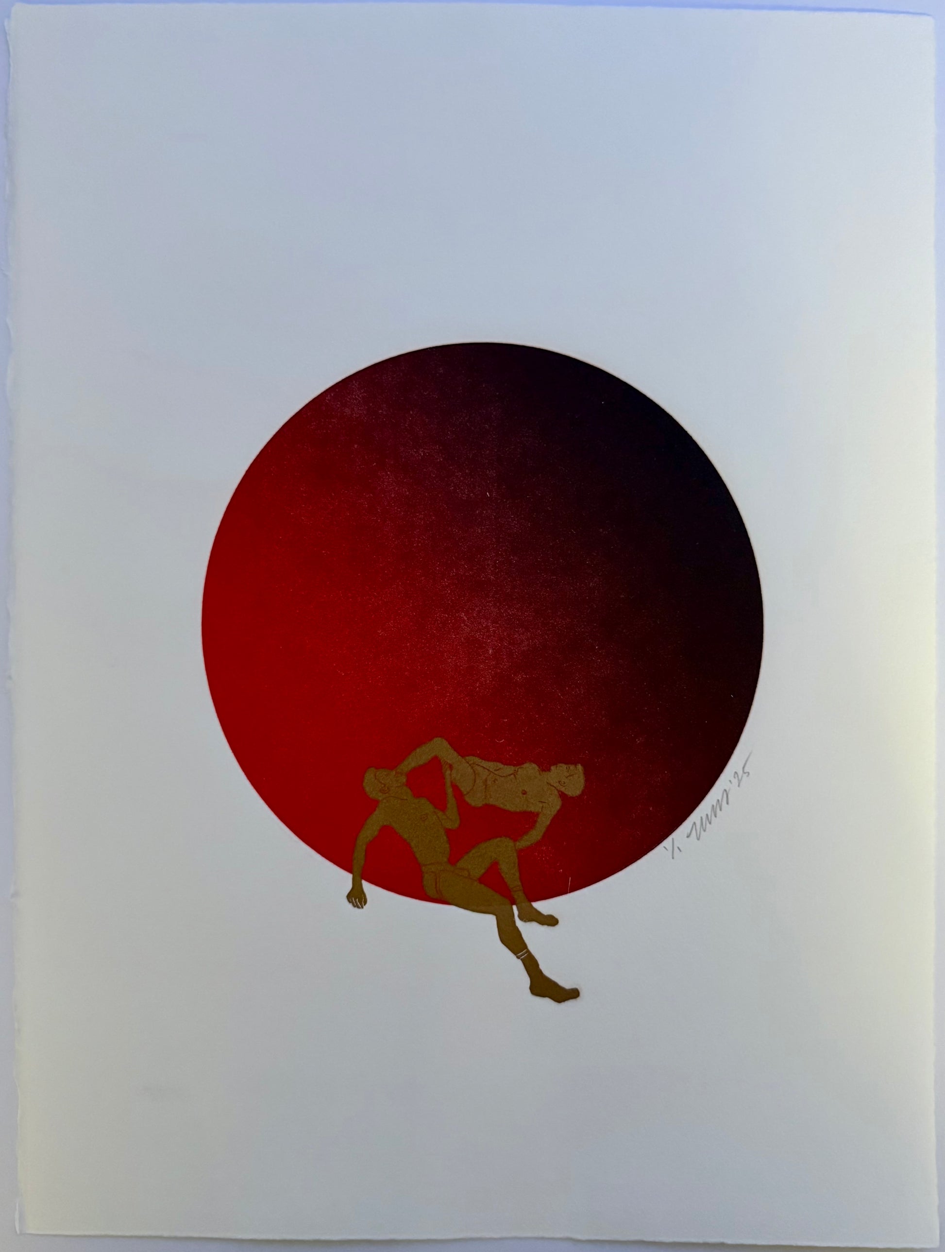 Two-layer loose print with gold figure printed on top of red/burgundy/black ombre circle. White paper. One-of-a-kind piece, signed as "1/1" — ‘one of one’.