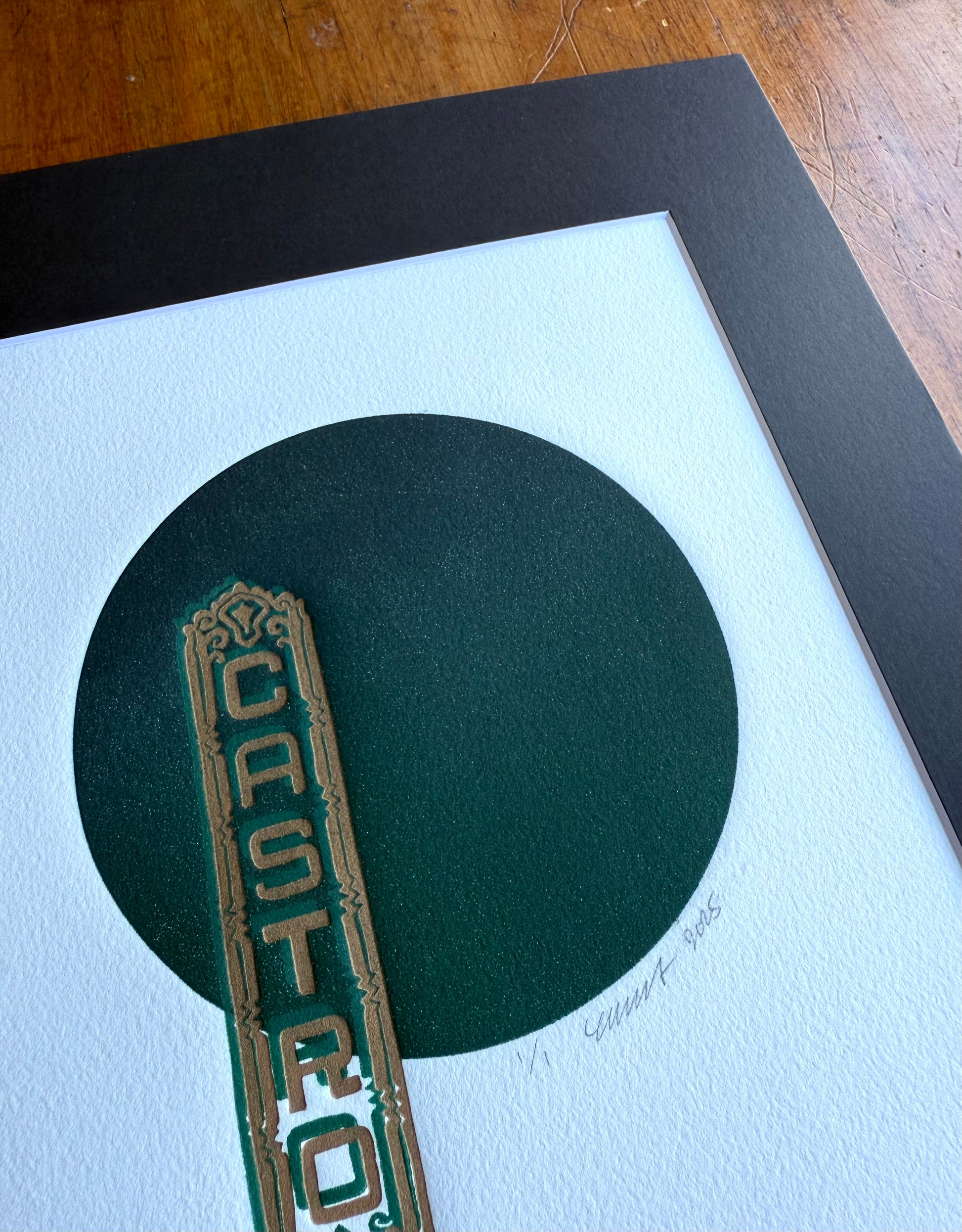Matted, three-layer print. Gold and teal linocut Castro Theatre sign overlayed on a rich dark teal/navy ombre circle. One-of-a-kind piece, signed as "1/1" — ‘one of one’.