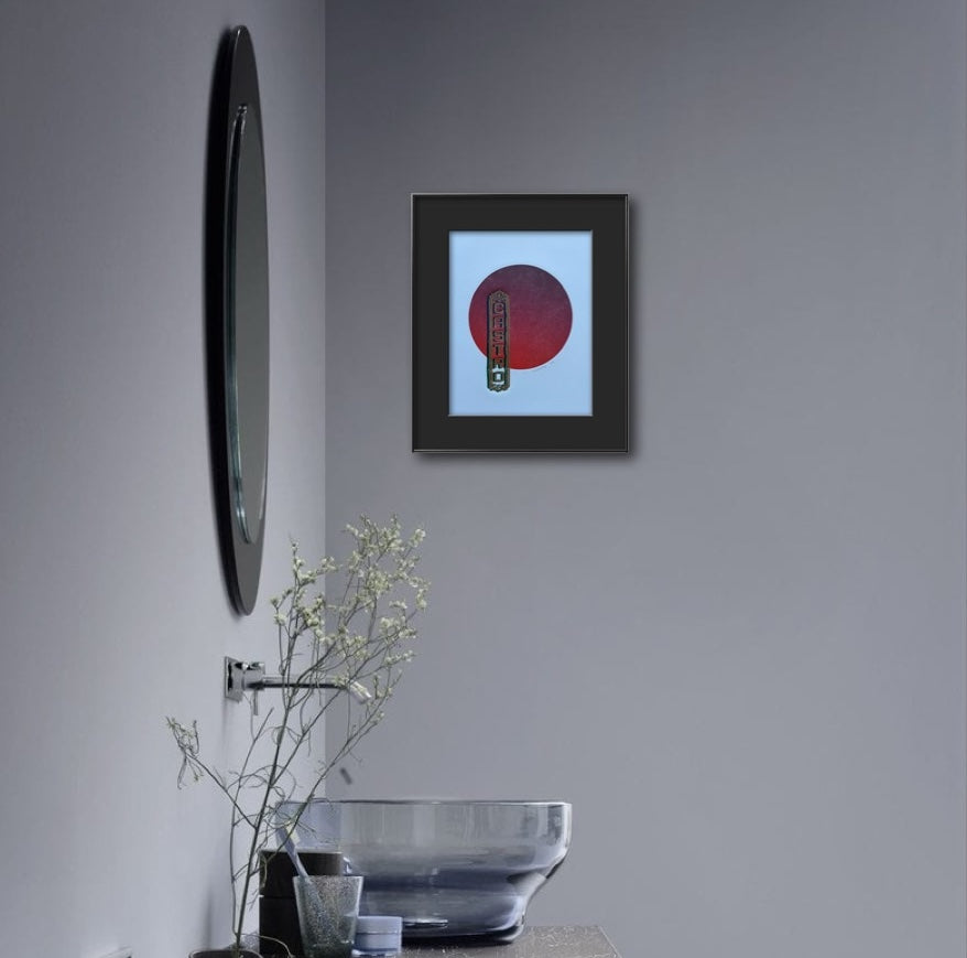 Matted, three-layer gold and blue-ombre linocut print. Castro Theatre sign overlayed on a vibrant red ombre circle.