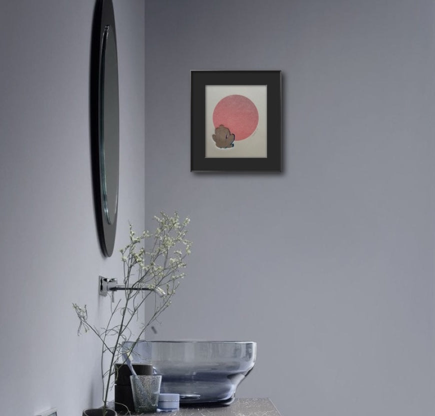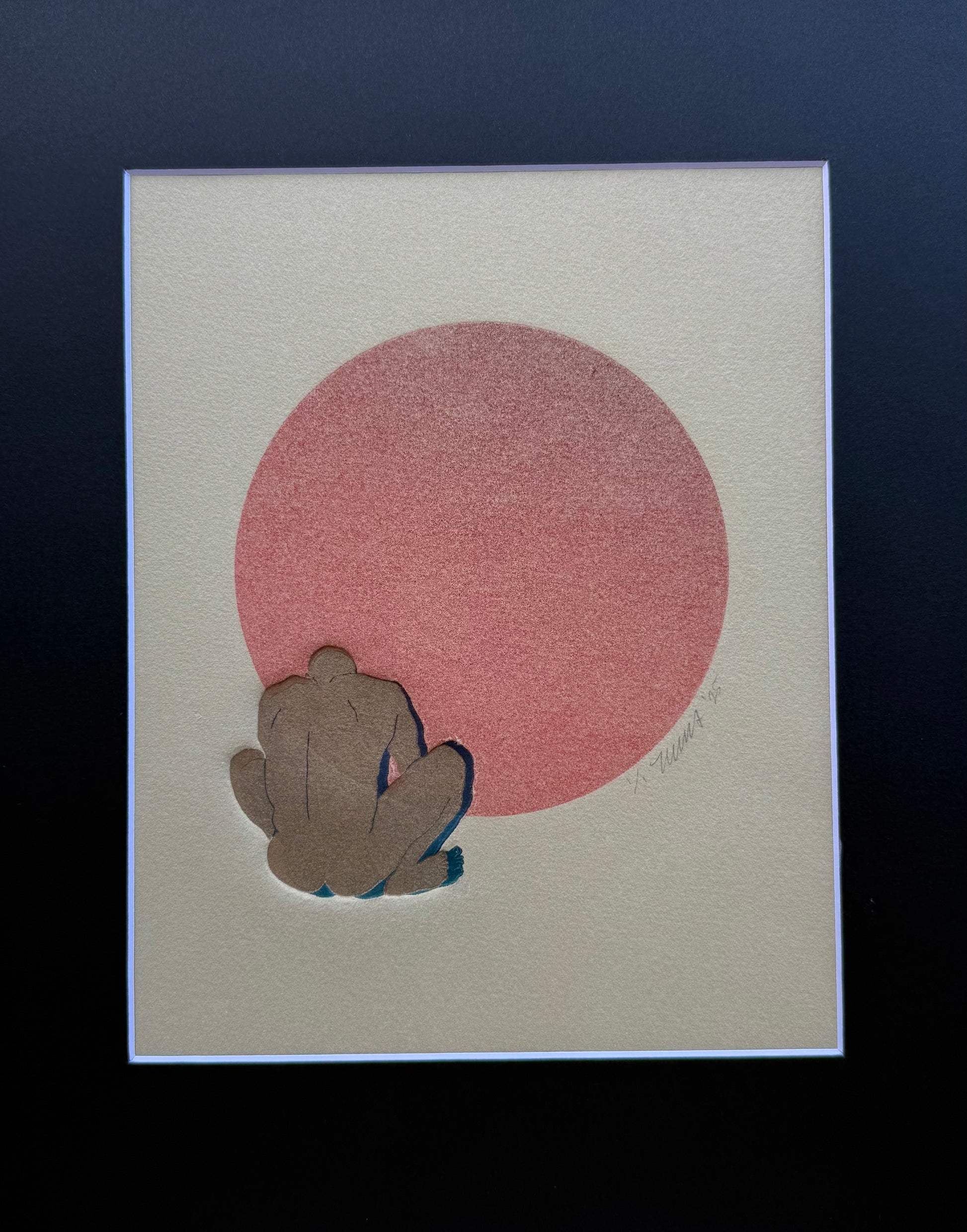 Three-layer gold and black linocut figure overlayed on a vibrant red ombre circle. Tan paper. One-of-a-kind piece, signed as "1/1" — ‘one of one’.