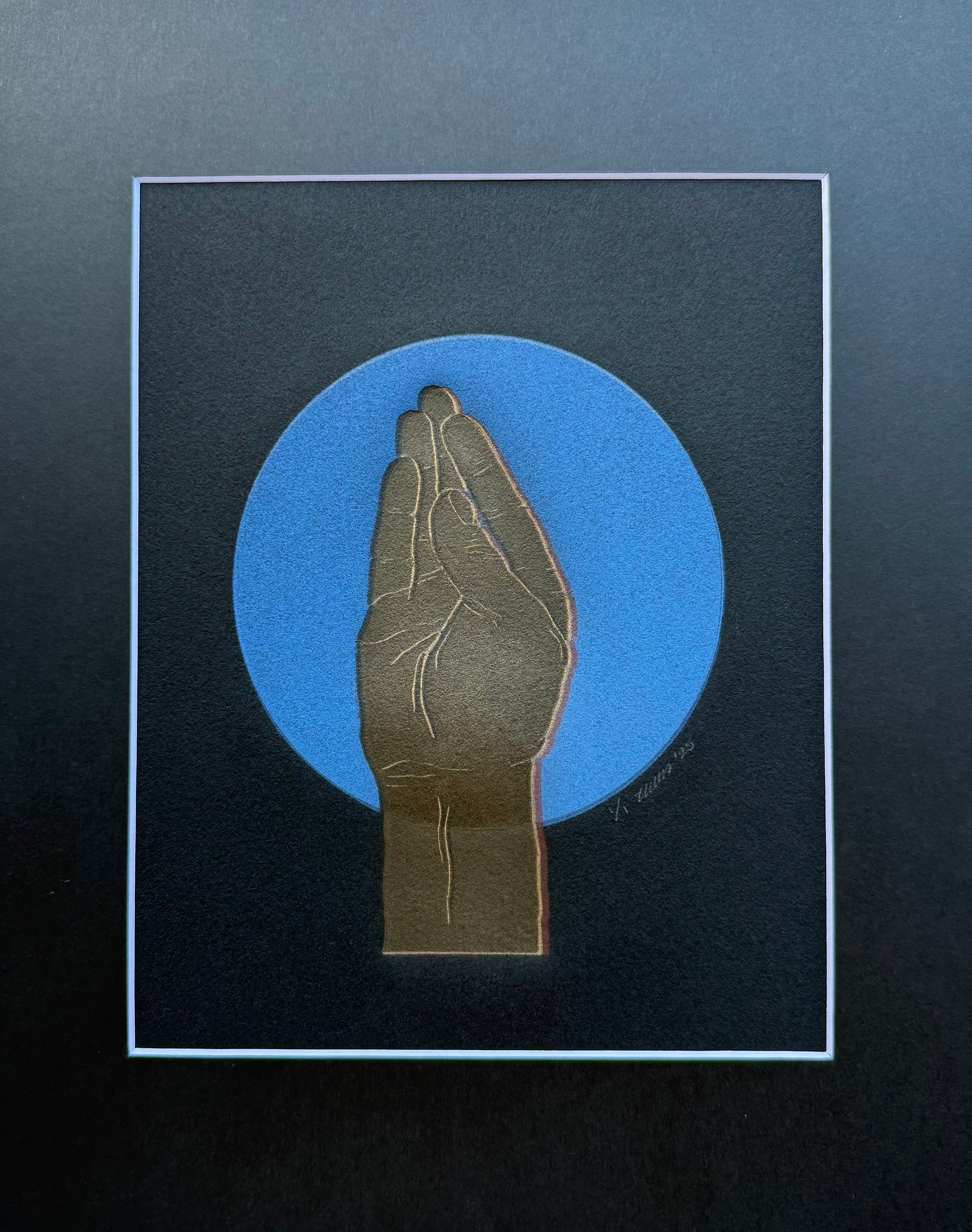 Matted, four-layer print with a gold linocut fist overlayed on a vibrant blue ombre circle. Black paper. One-of-a-kind piece, signed as "1/1" — ‘one of one’.