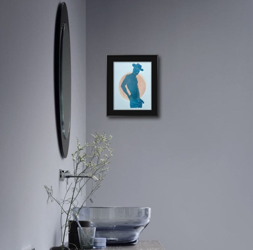 Matted, three-layer print of a light blue cowboy figure that sits on top of a set of intersecting orange circles. White paper. One-of-a-kind piece, signed as "1/1" — ‘one of one’.