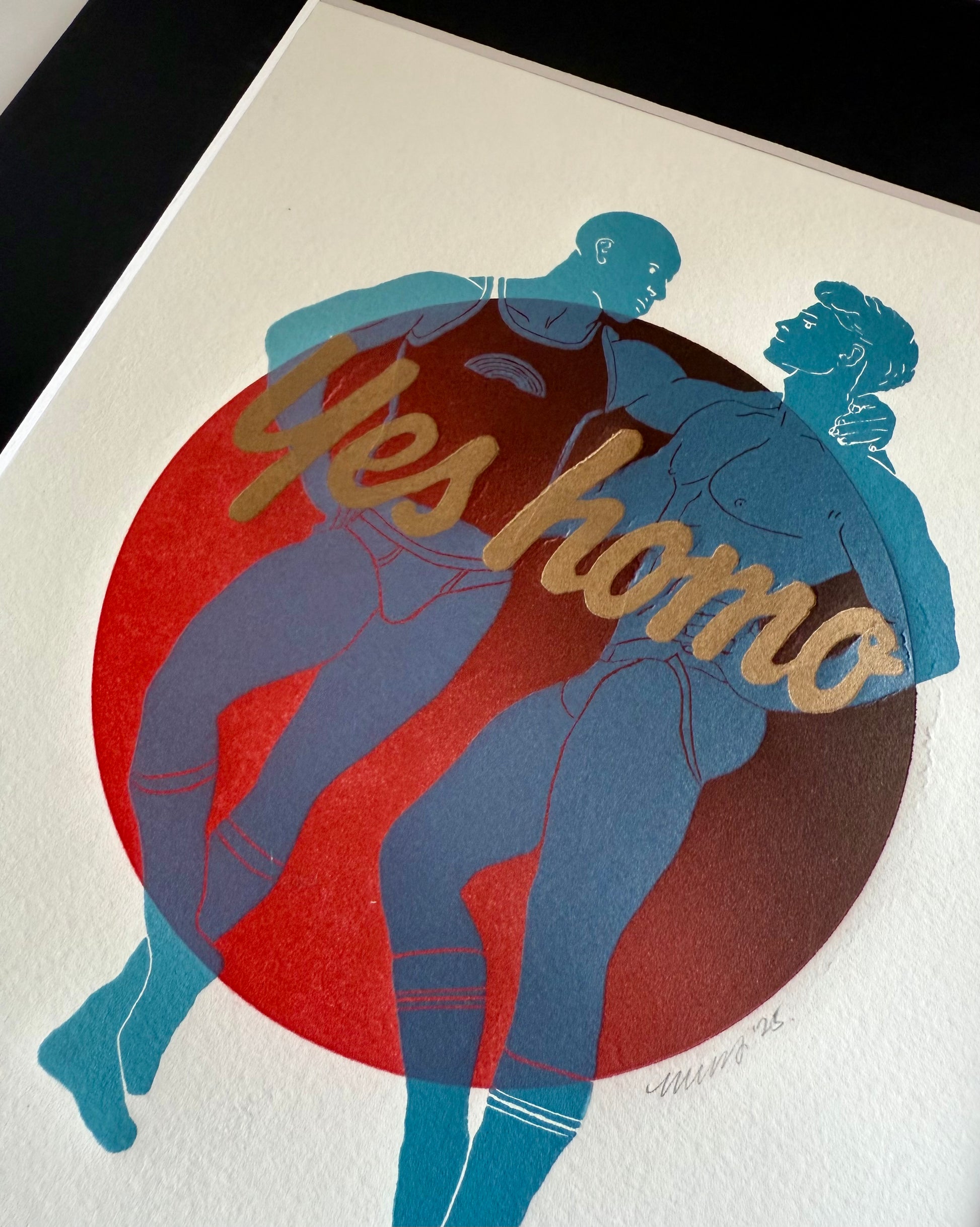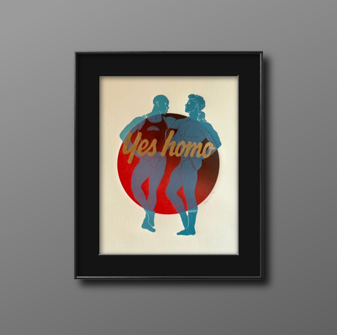 Matted, three-layer print with gold, “Yes homo”, overlayed on a set of blue figures, which sit on top of a vibrant red ombre circle. White paper.