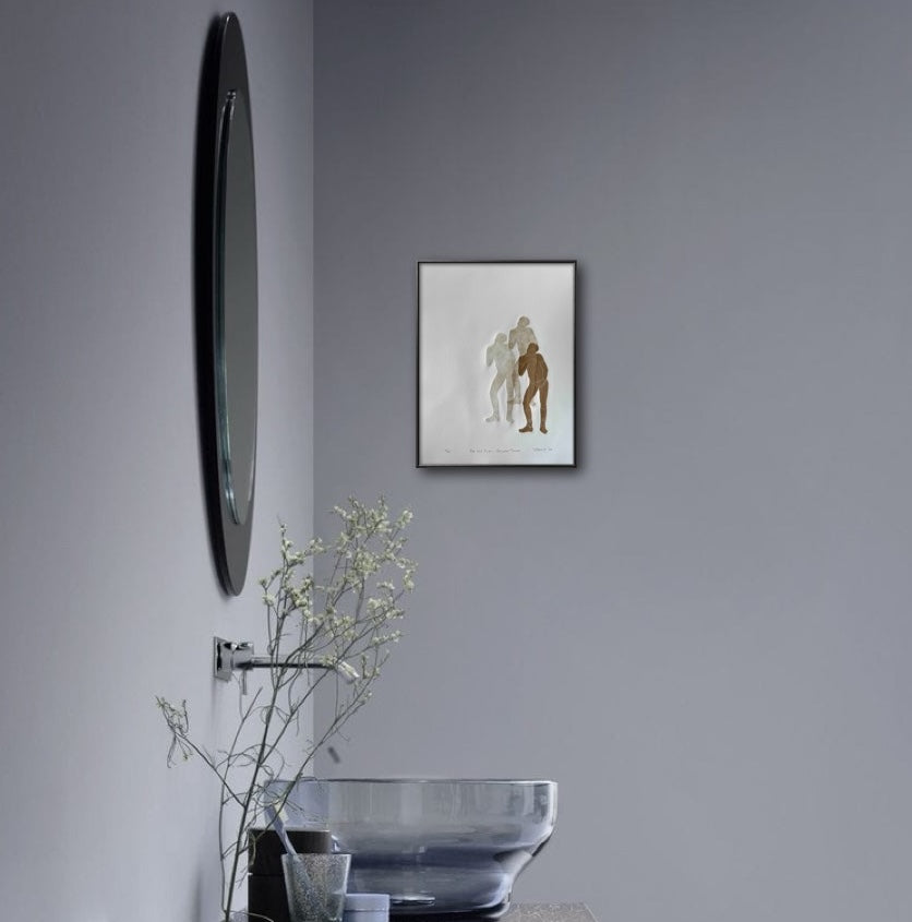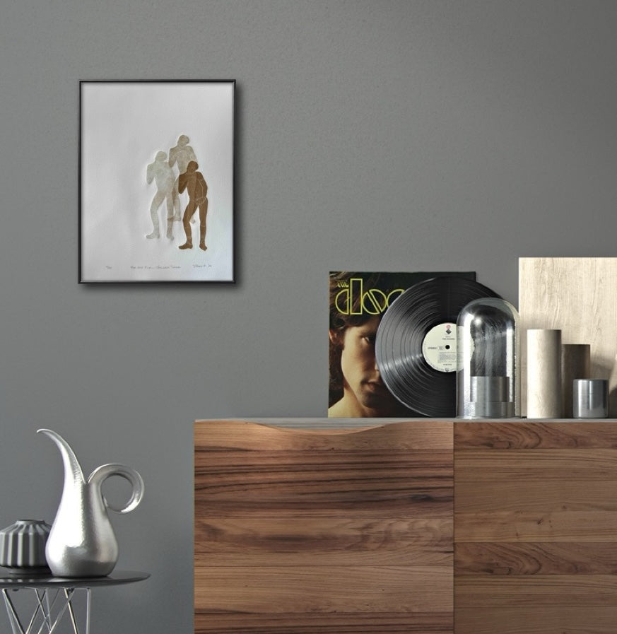 Each art piece is hand-printed on an analog printing press with oil-based inks on archival paper. The figure is created from a carved linocut ‘plate’ that is then printed multiple times, without re-inking. The process is called, “ghosting". The process results in a beautiful embossment of both the figures - I’ve included an image in the gallery as a visual reference.