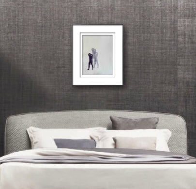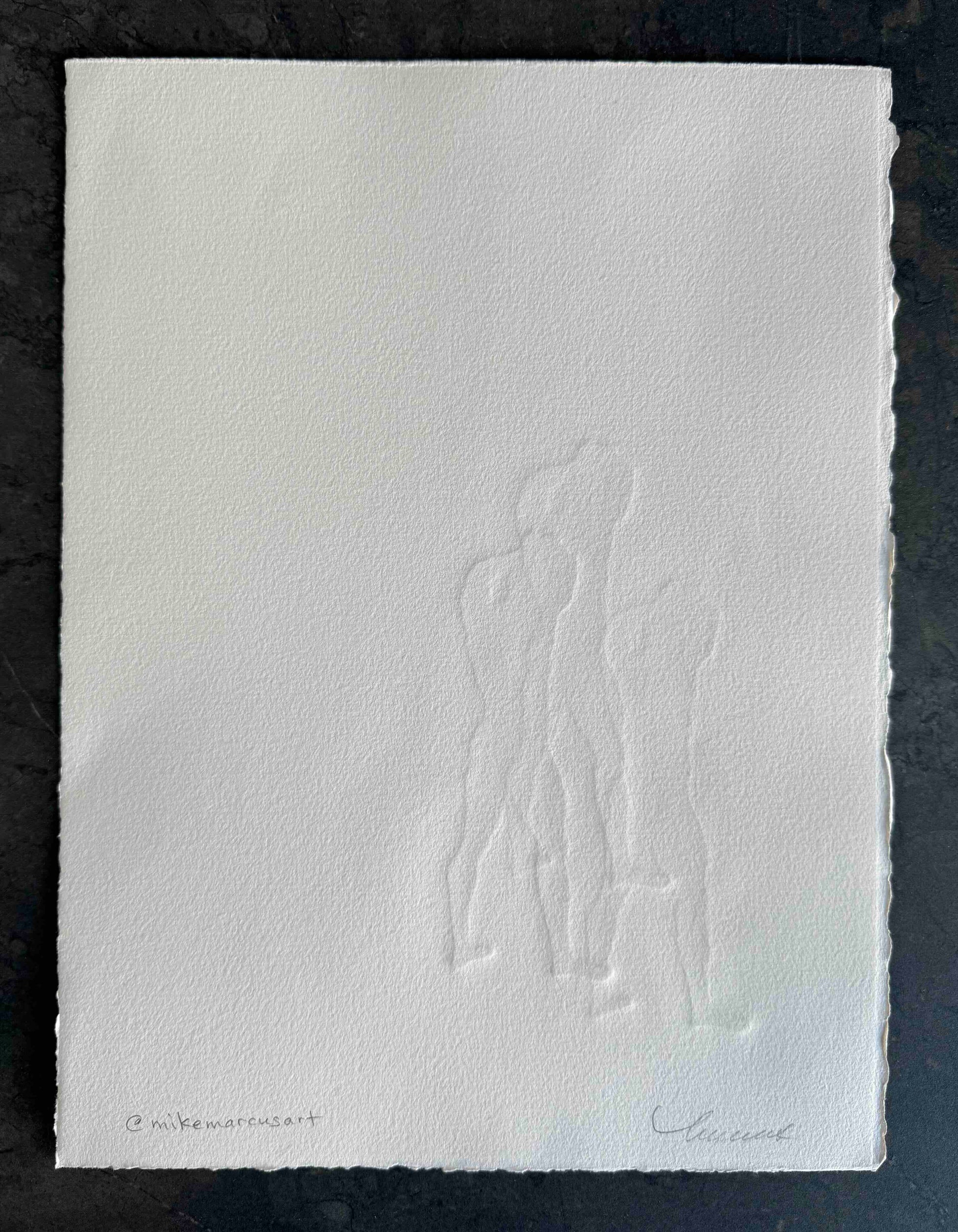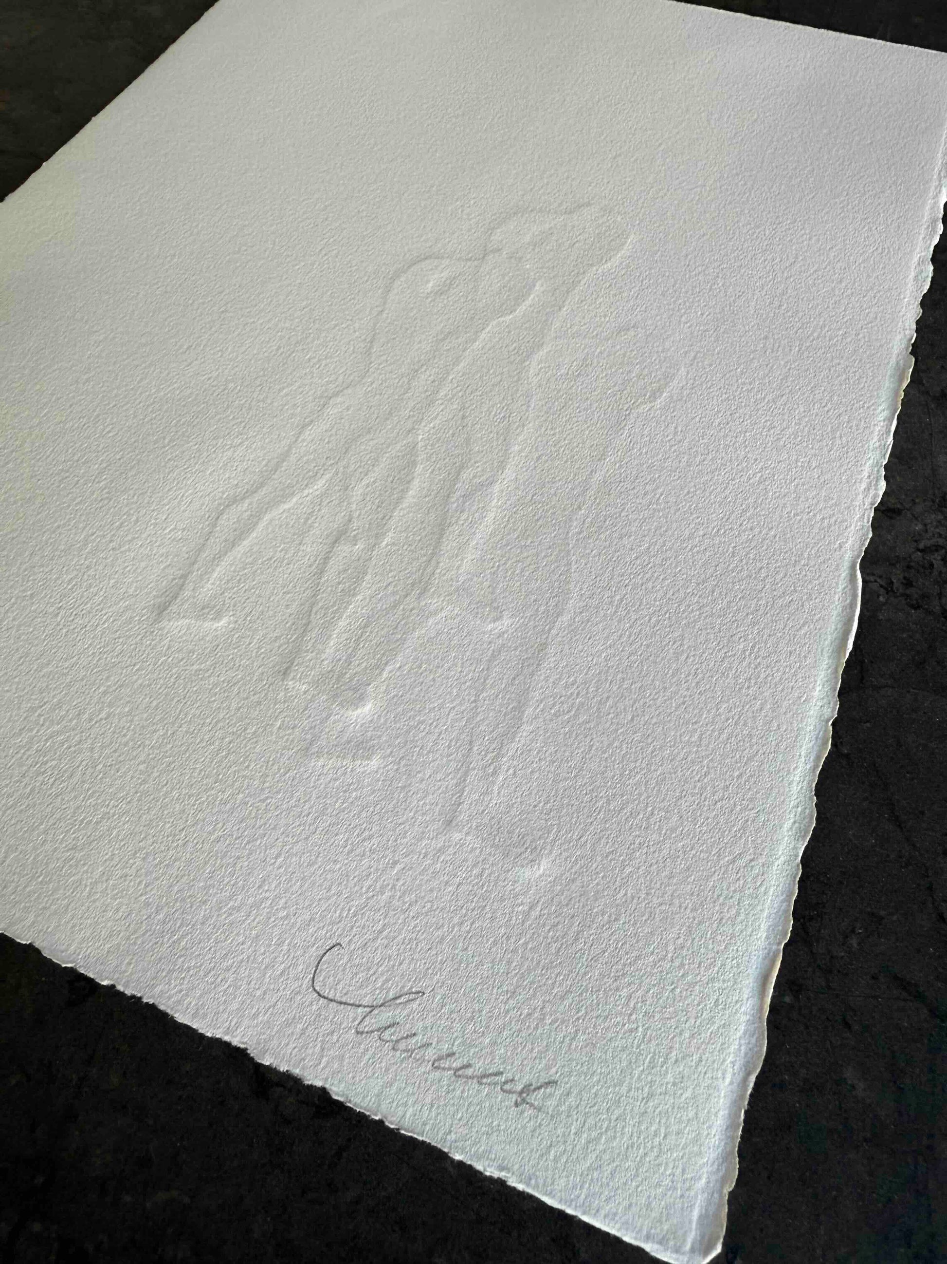 Each art piece is hand-printed on an analog printing press with oil-based inks on archival paper. The figure is created from a carved linocut ‘plate’ that is then printed multiple times, without re-inking. The process is called, “ghosting". The process results in a beautiful embossment of both the figures - I’ve included an image in the gallery as a visual reference.