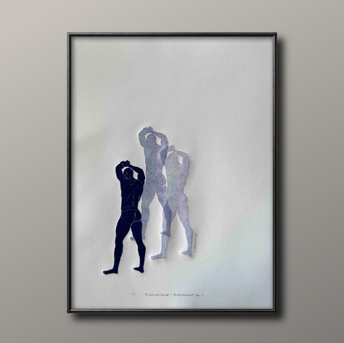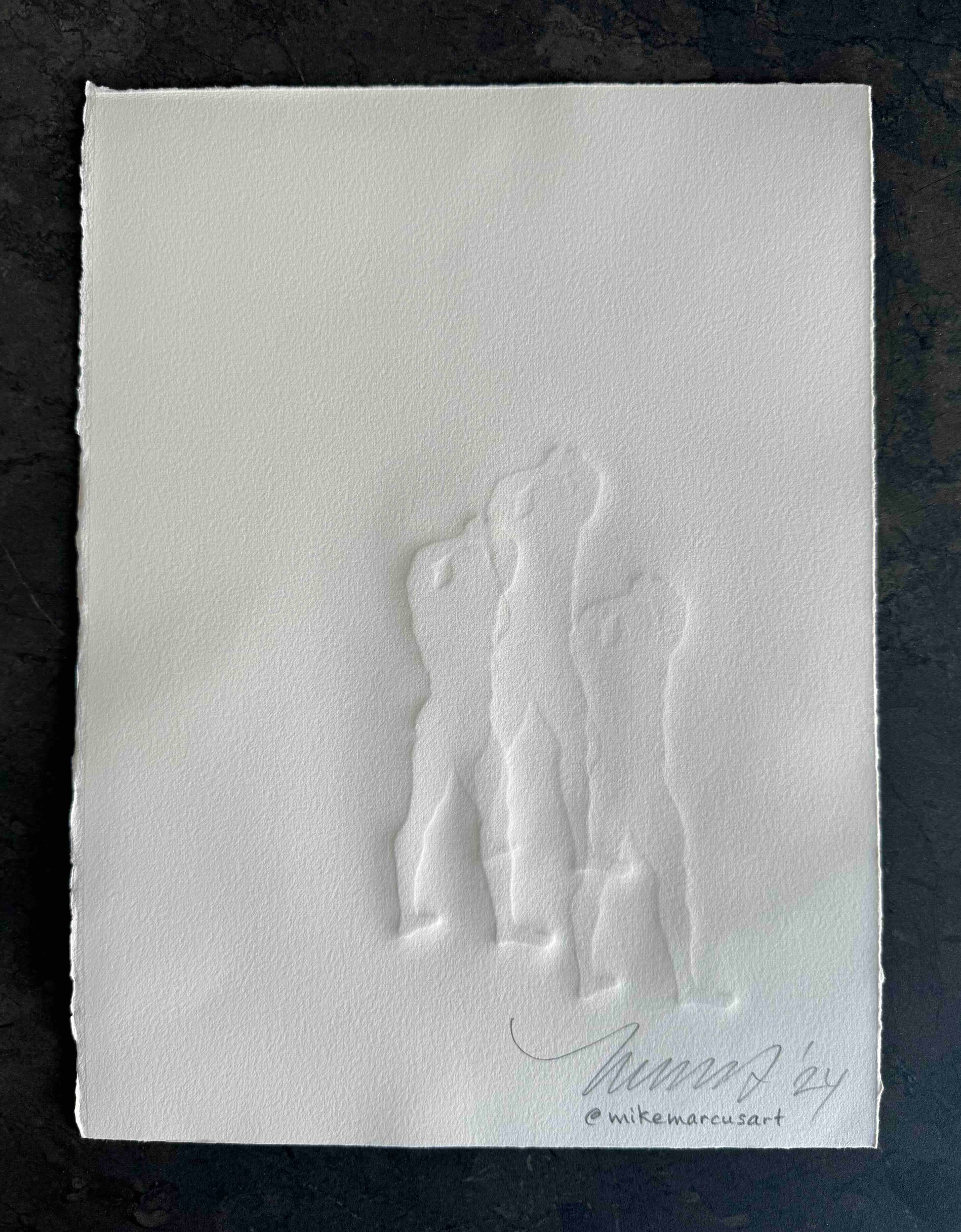 Each art piece is hand-printed on an analog printing press with oil-based inks on archival paper. The figure is created from a carved linocut ‘plate’ that is then printed multiple times, without re-inking. The process is called, “ghosting". The process results in a beautiful embossment of both the figures - I’ve included an image in the gallery as a visual reference.