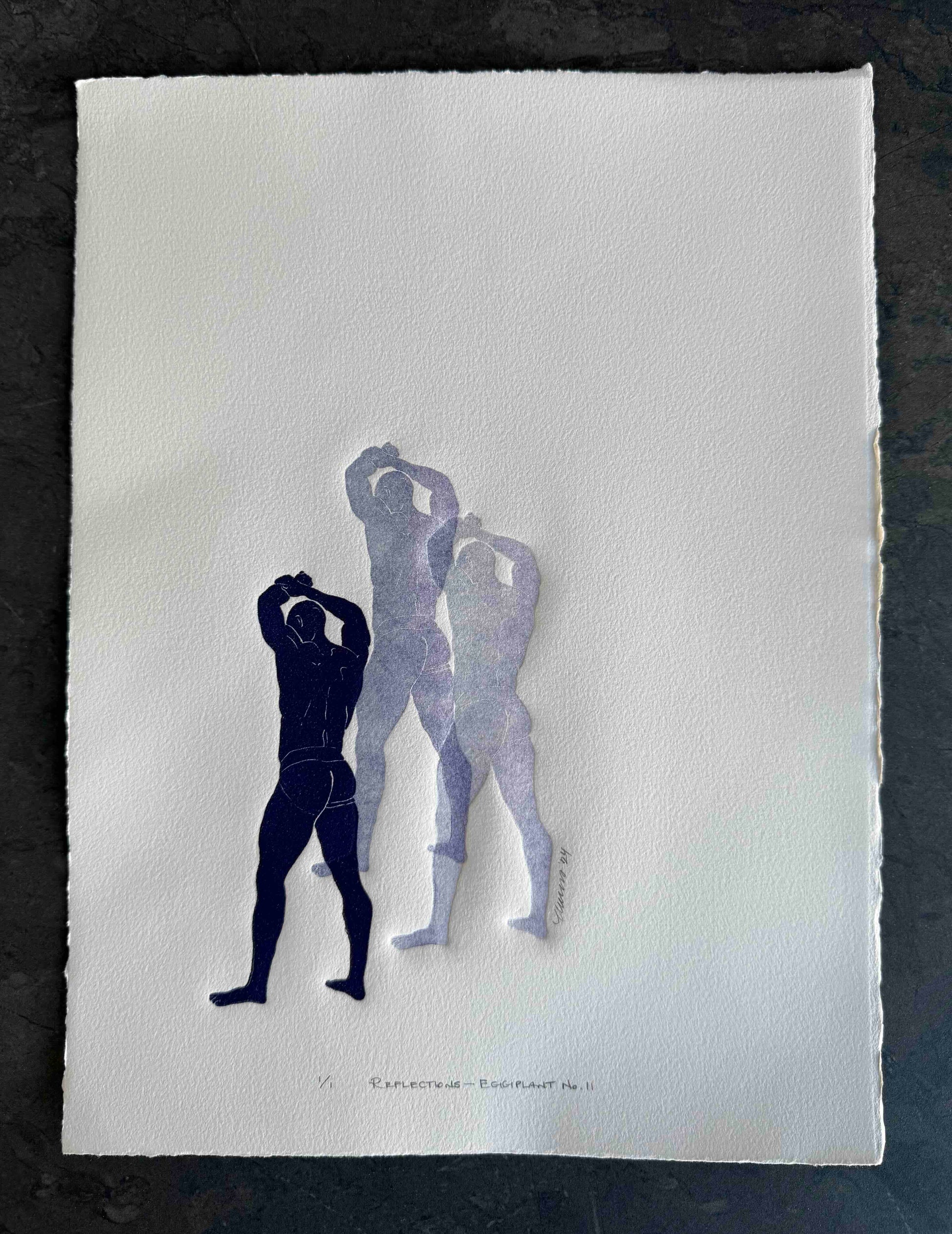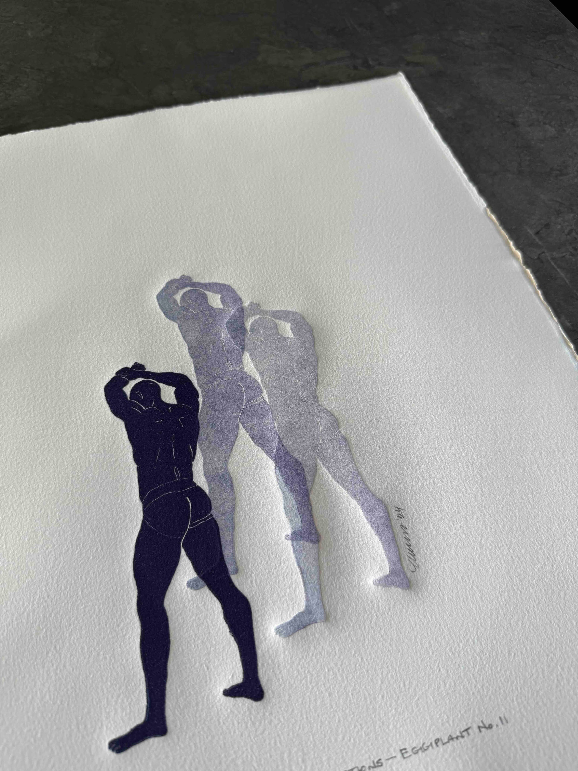 Eggplant Purple Linocut Figures. One-of-a-kind piece, signed as "1/1" — ‘one of one’.