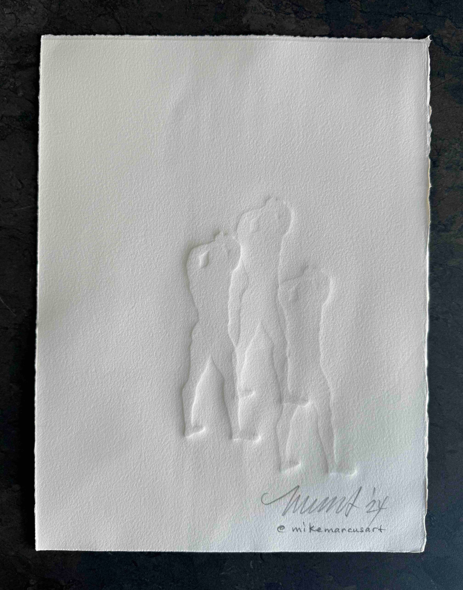 Each art piece is hand-printed on an analog printing press with oil-based inks on archival paper. The figure is created from a carved linocut ‘plate’ that is then printed multiple times, without re-inking. The process is called, “ghosting". The process results in a beautiful embossment of both the figures - I’ve included an image in the gallery as a visual reference.