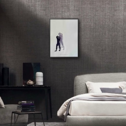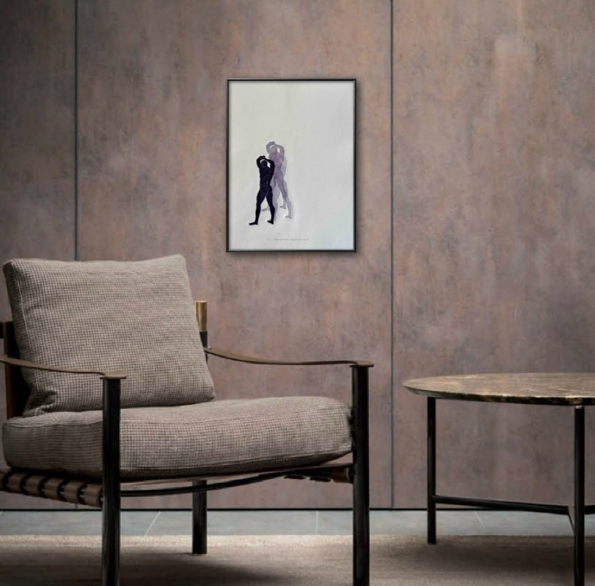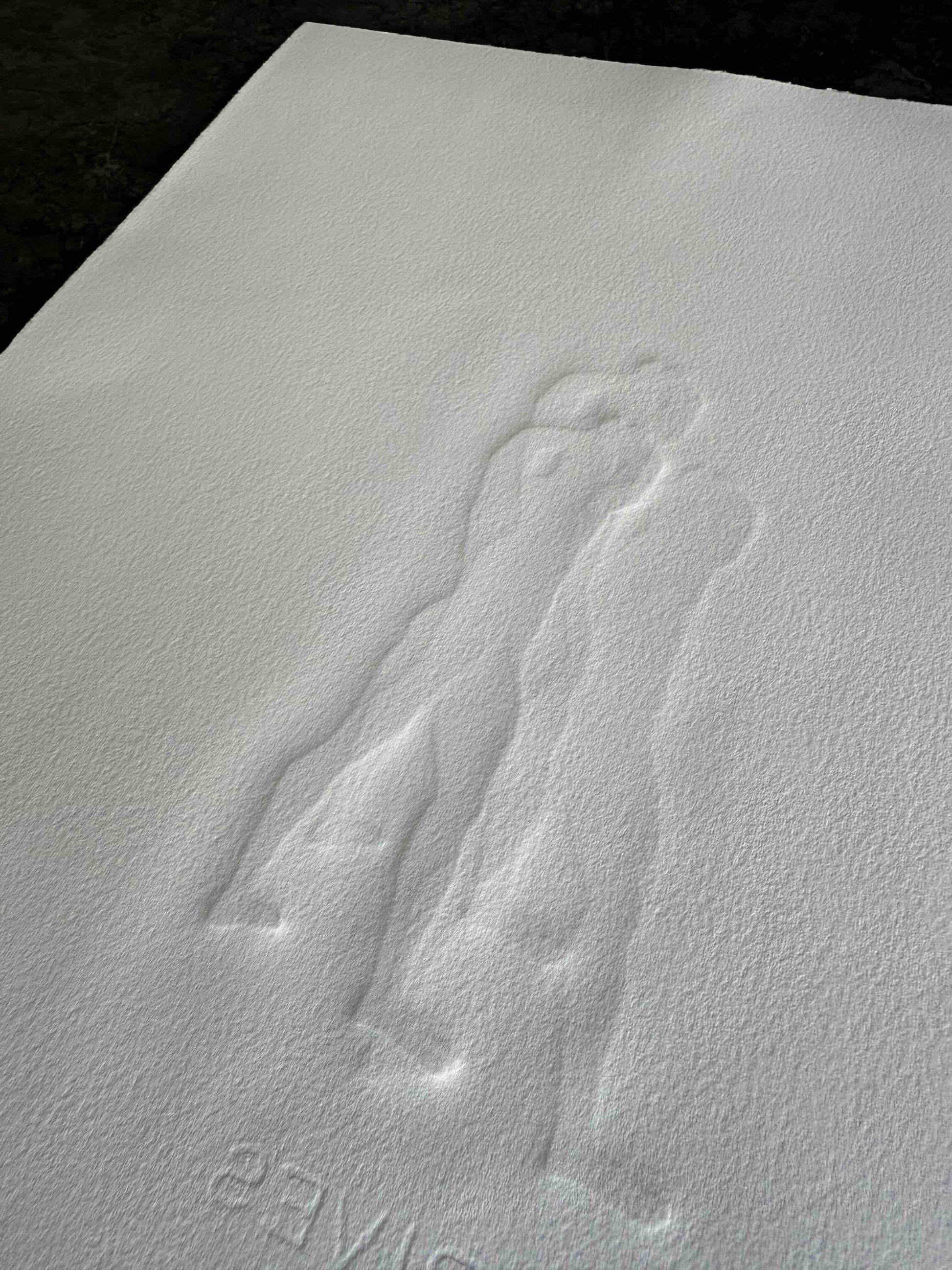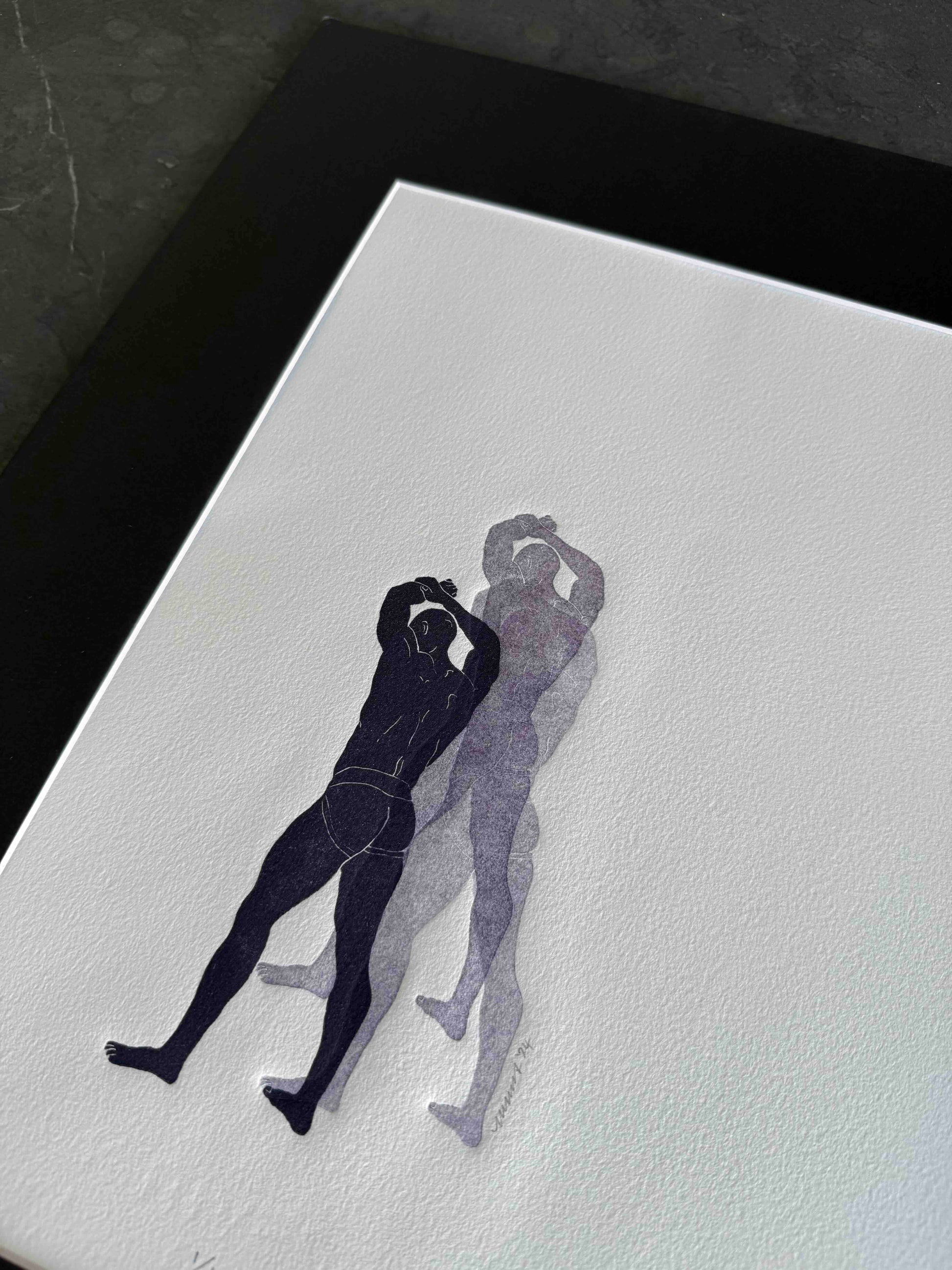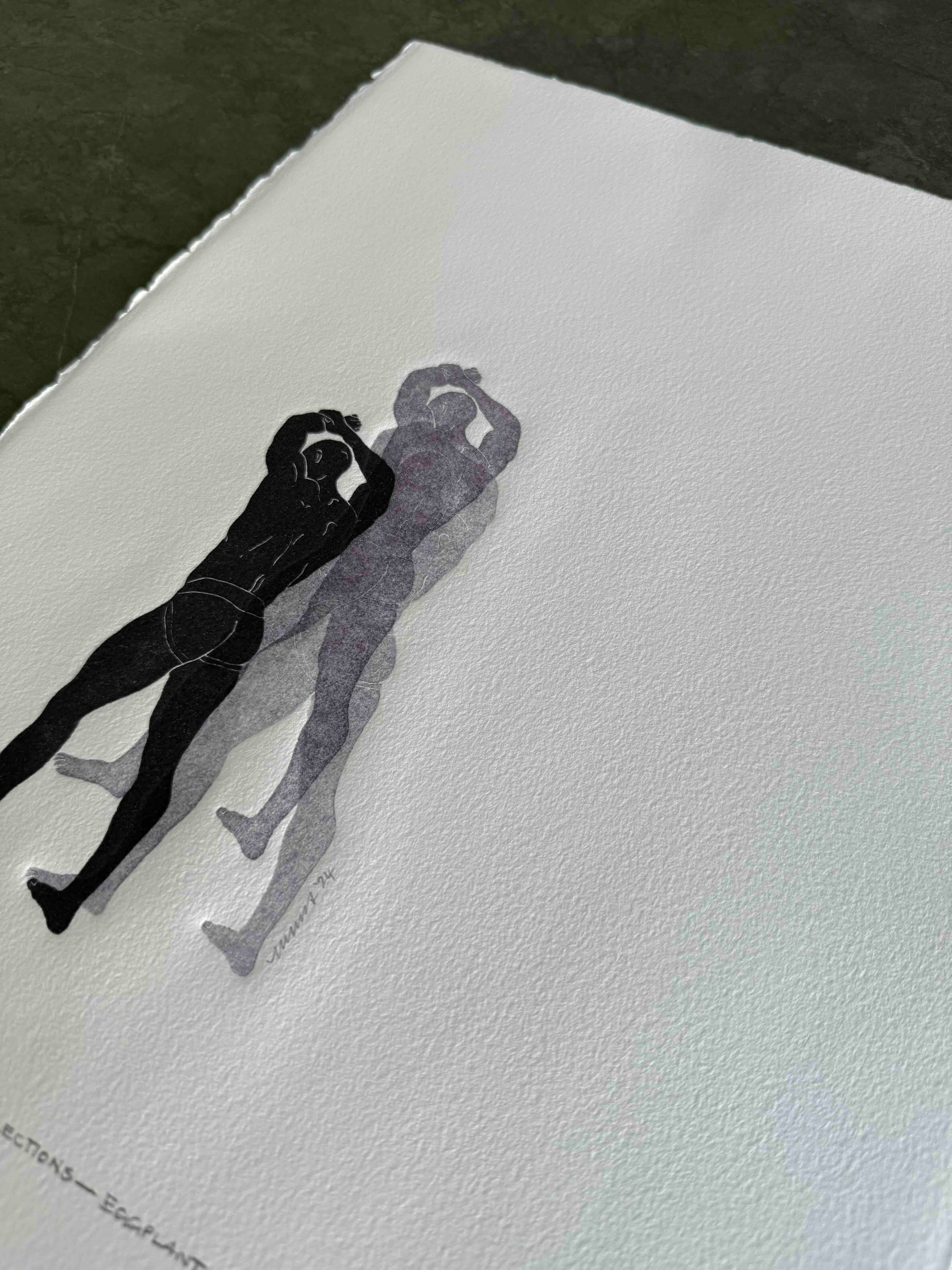 Each art piece is hand-printed on an analog printing press with oil-based inks on archival paper. The figure is created from a carved linocut ‘plate’ that is then printed multiple times, without re-inking. The process is called, “ghosting". The process results in a beautiful embossment of both the figures - I’ve included an image in the gallery as a visual reference.