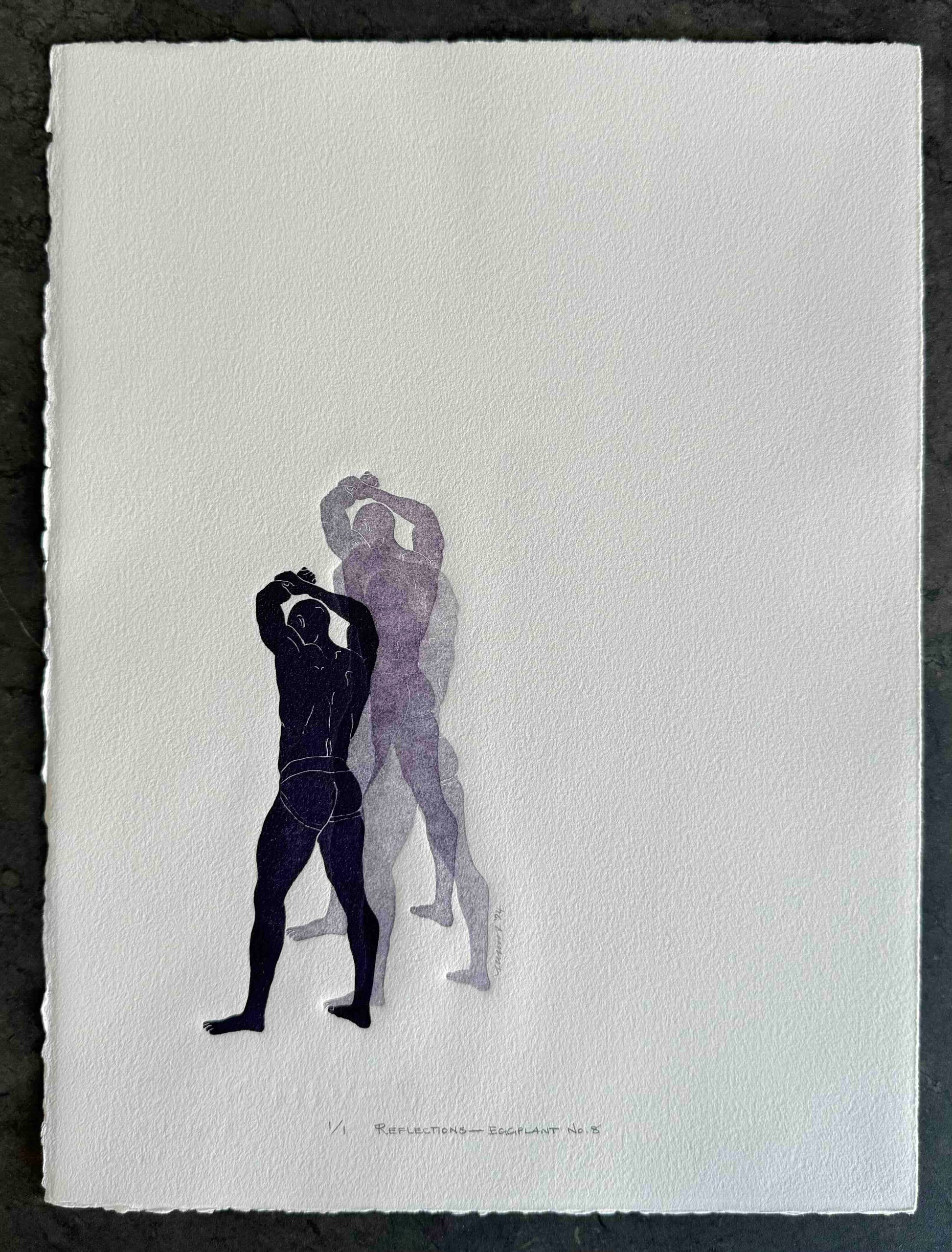 Eggplant Purple Linocut Figures. One-of-a-kind piece, signed as "1/1" — ‘one of one’.