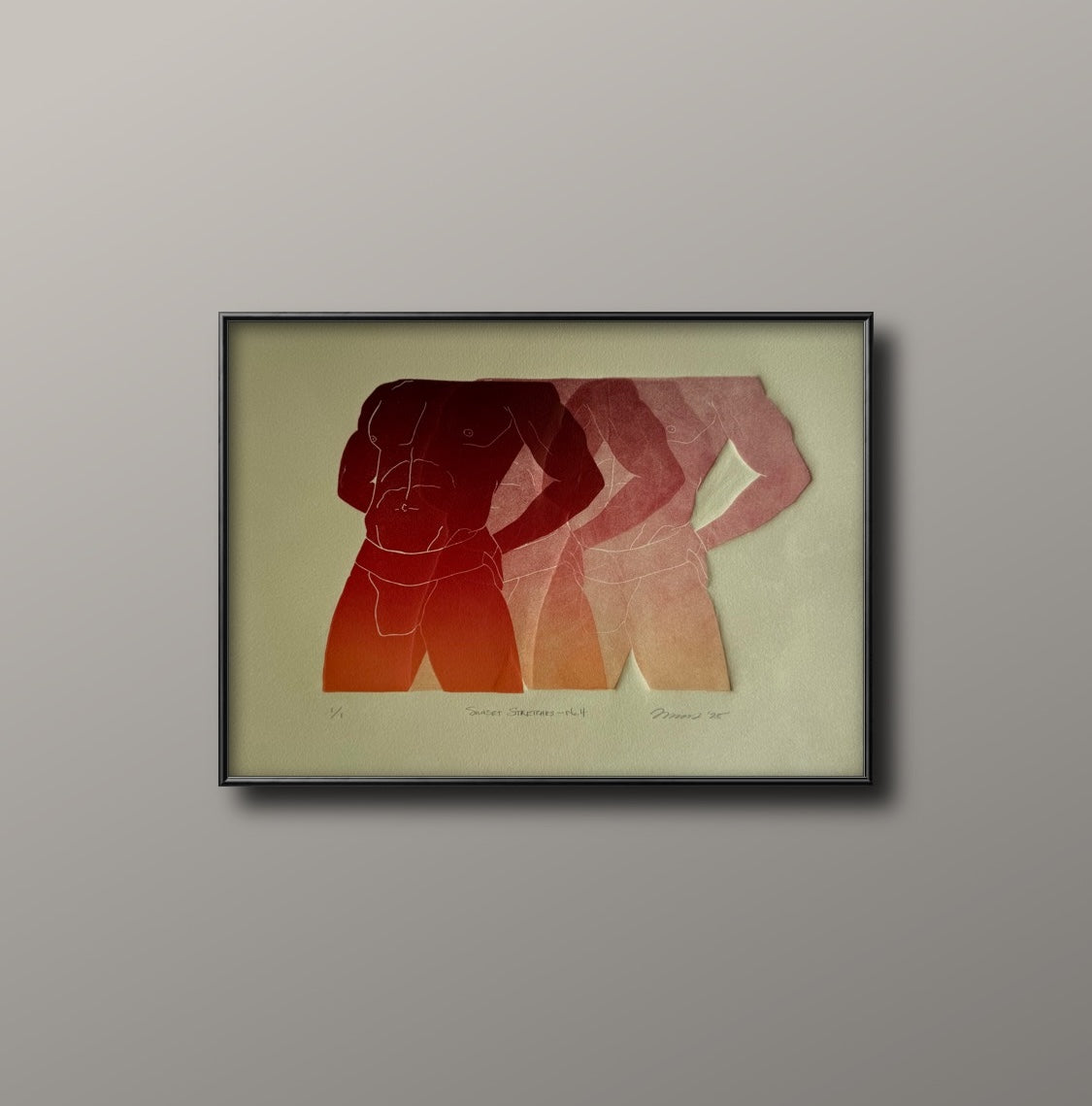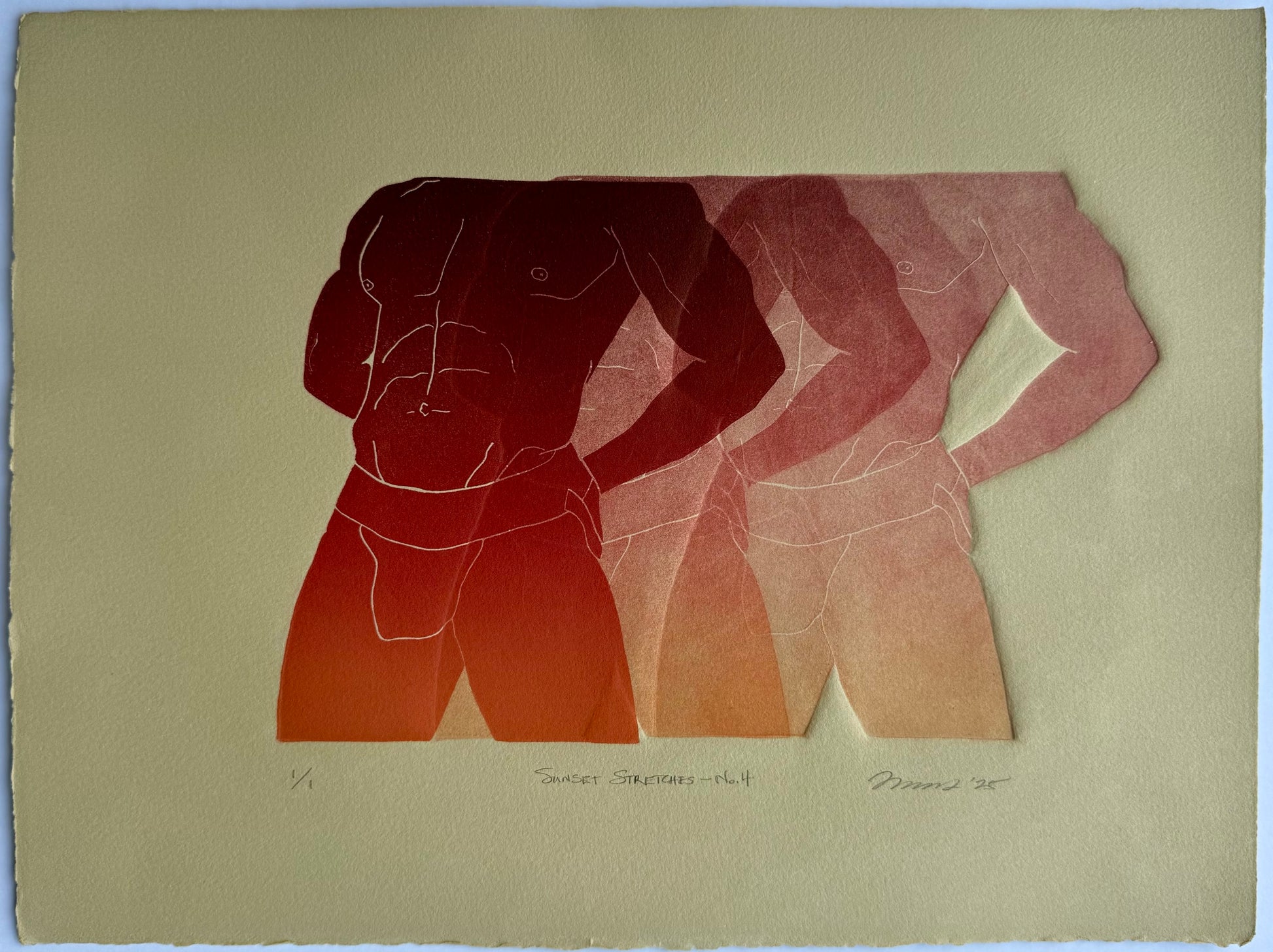 Three-layer loose print with repeating figures in orange/red “rainbow roll”. Tan paper. One-of-a-kind piece, signed as "1/1" — ‘one of one’.