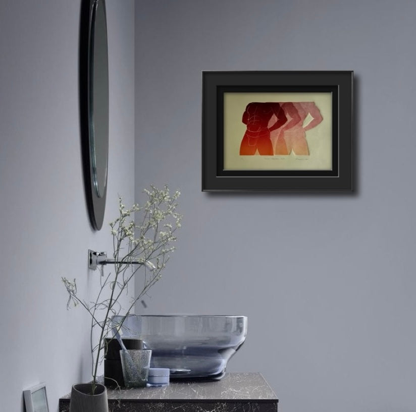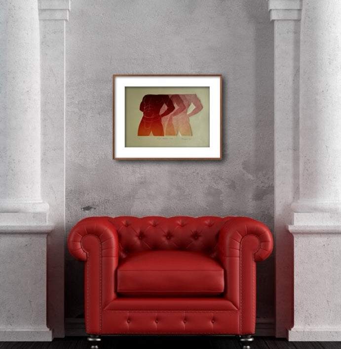 Each art piece is hand-printed on an analog printing press with oil-based inks on archival paper. The figure is created from a carved linocut ‘plate’ that is then printed multiple times, without re-inking. The process is called, “ghosting". The process results in a beautiful embossment of both the figures - I’ve included an image in the gallery as a visual reference.