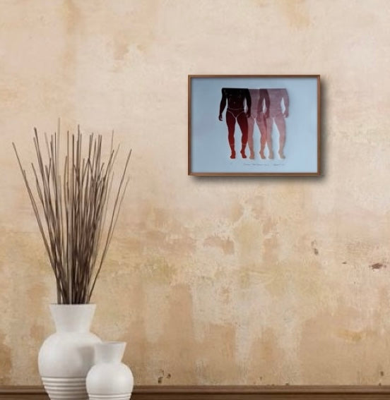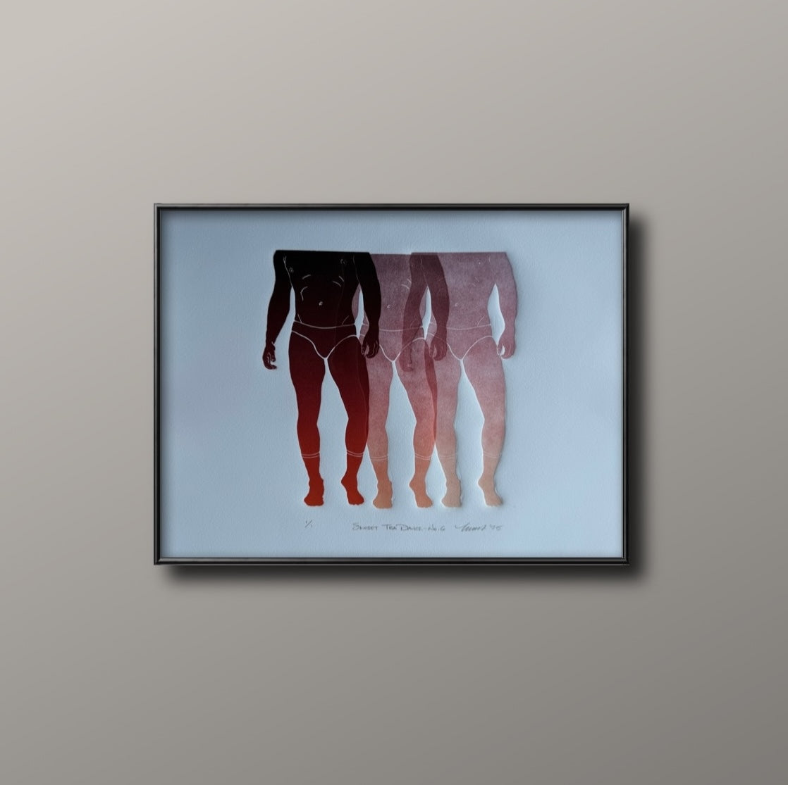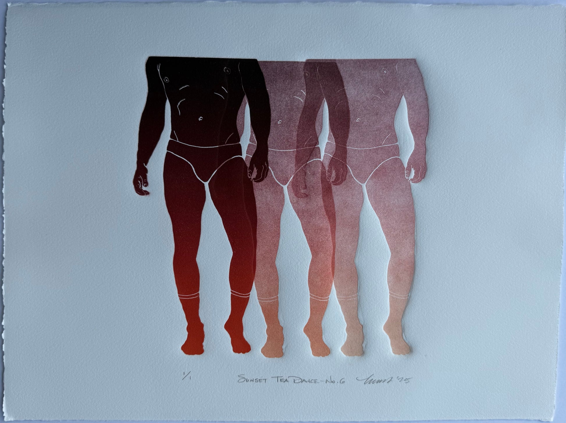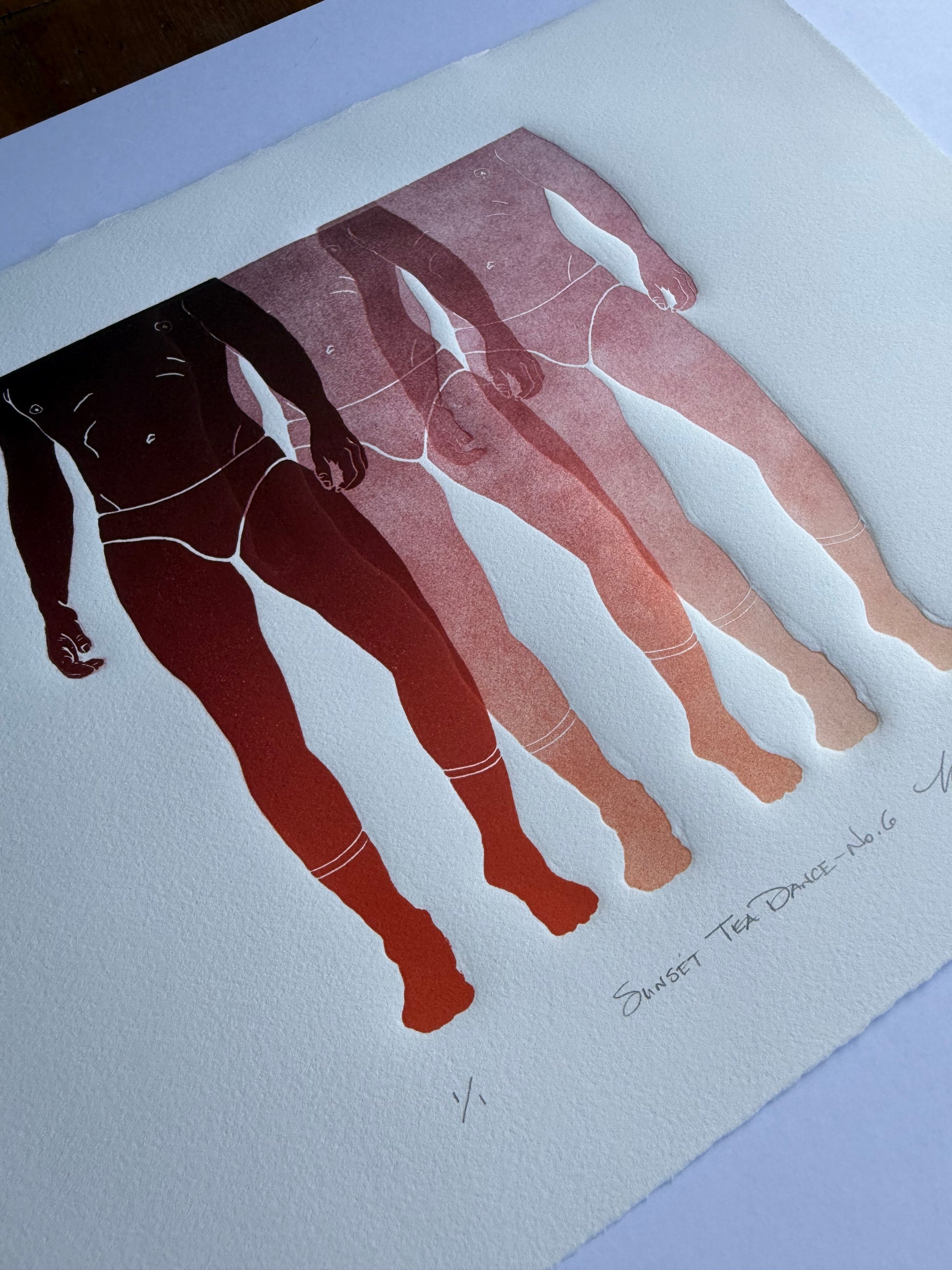 Three-layer print with repeating figures in orange/red “rainbow roll”. White paper. One-of-a-kind piece, signed as "1/1" — ‘one of one’.