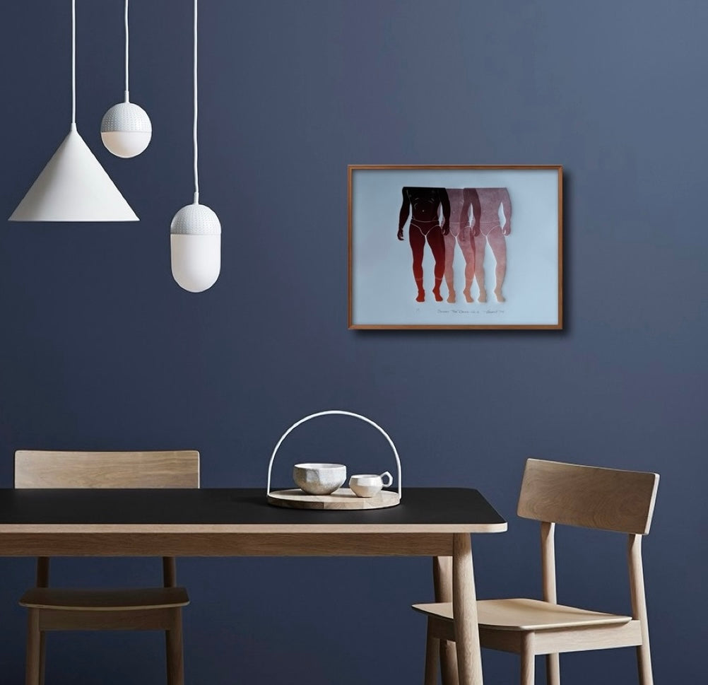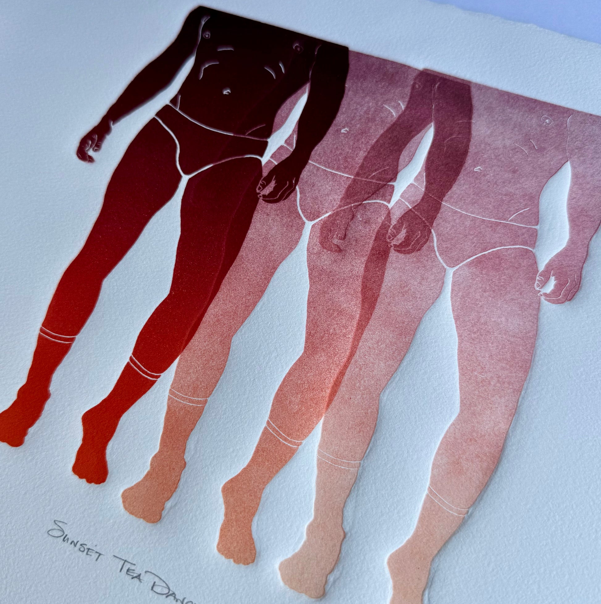 Each art piece is hand-printed on an analog printing press with oil-based inks on archival paper. The figure is created from a carved linocut ‘plate’ that is then printed multiple times, without re-inking. The process is called, “ghosting". The process results in a beautiful embossment of both the figures - I’ve included an image in the gallery as a visual reference.