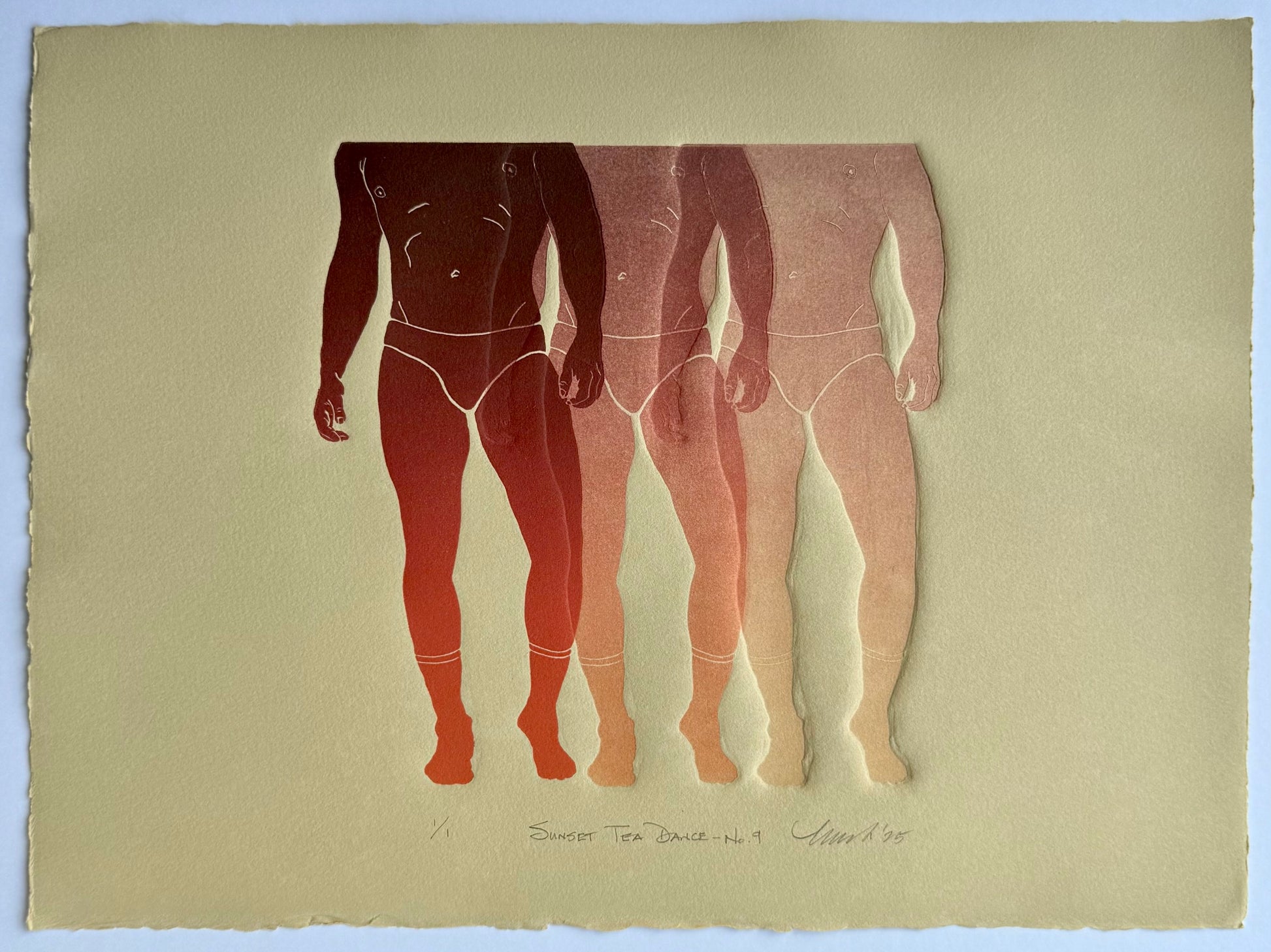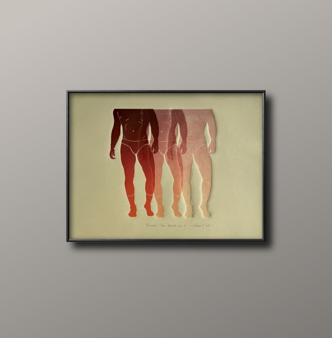 Three-layer print with repeating figures in orange/red “rainbow roll”. Tan paper. One-of-a-kind piece, signed as "1/1" — ‘one of one’.