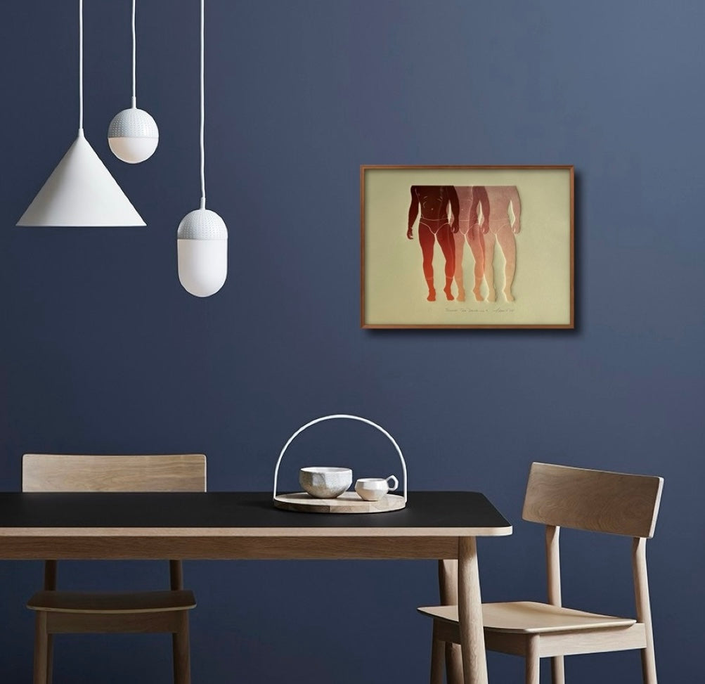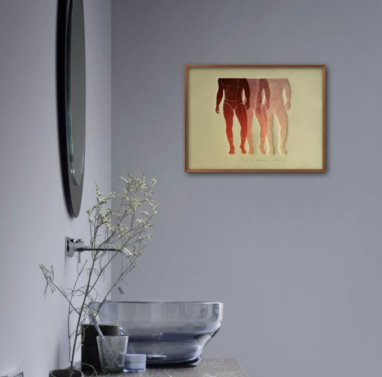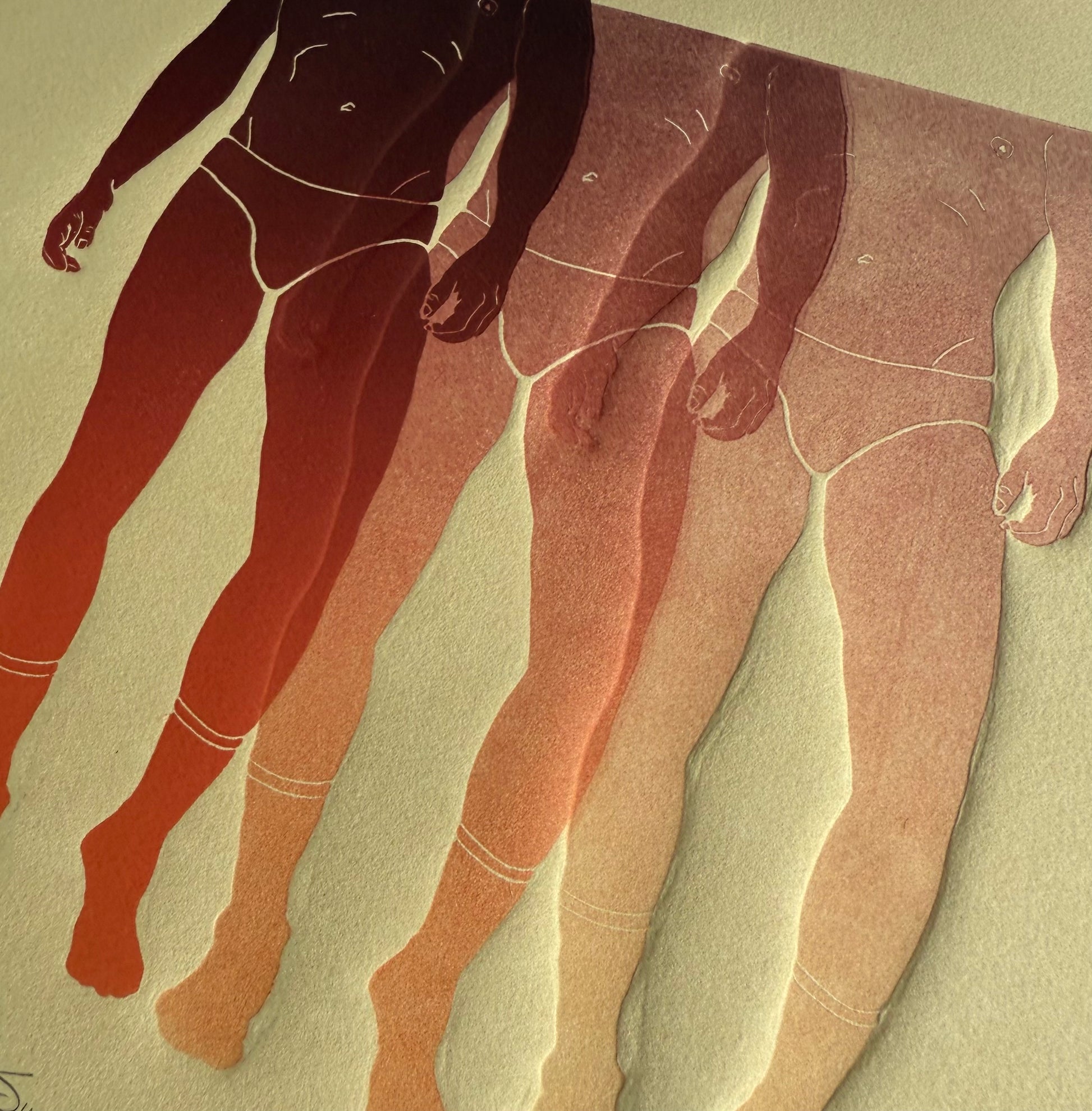 Each art piece is hand-printed on an analog printing press with oil-based inks on archival paper. The figure is created from a carved linocut ‘plate’ that is then printed multiple times, without re-inking. The process is called, “ghosting". The process results in a beautiful embossment of both the figures - I’ve included an image in the gallery as a visual reference.