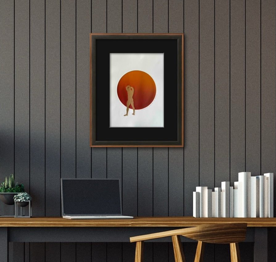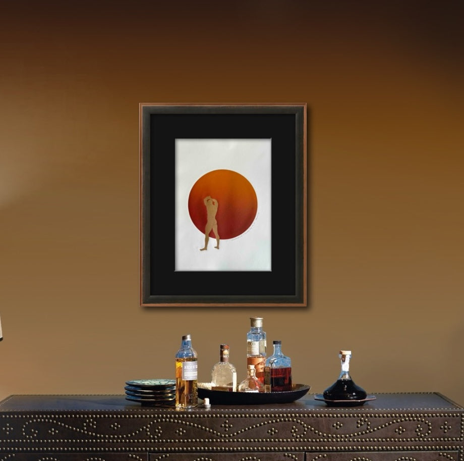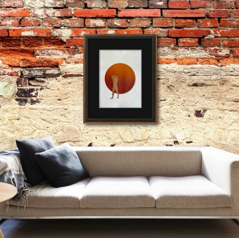 Gold Linocut Figure on Orange-Brick Red Ombre circle. One-of-a-kind piece, signed as "1/1" — ‘one of one’.
