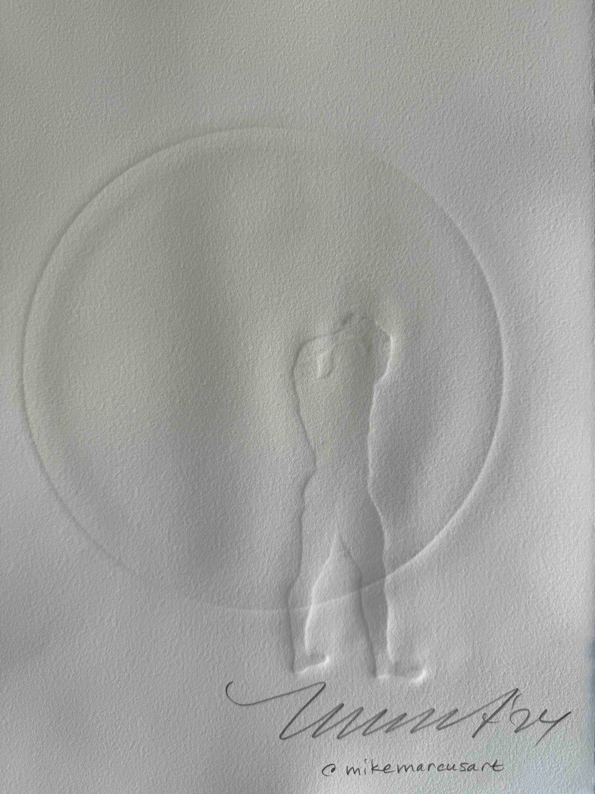 Each art piece is hand-printed on an analog printing press with oil-based inks on archival paper. The circle is printed first with a “rainbow roll” on monotype plate. The linocut figures are then printed as an overlay to the circle. The process creates a beautiful embossment of both the figure, and the circle - I’ve included an image in the gallery as a visual reference.
