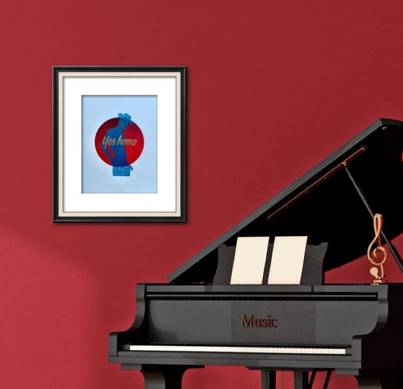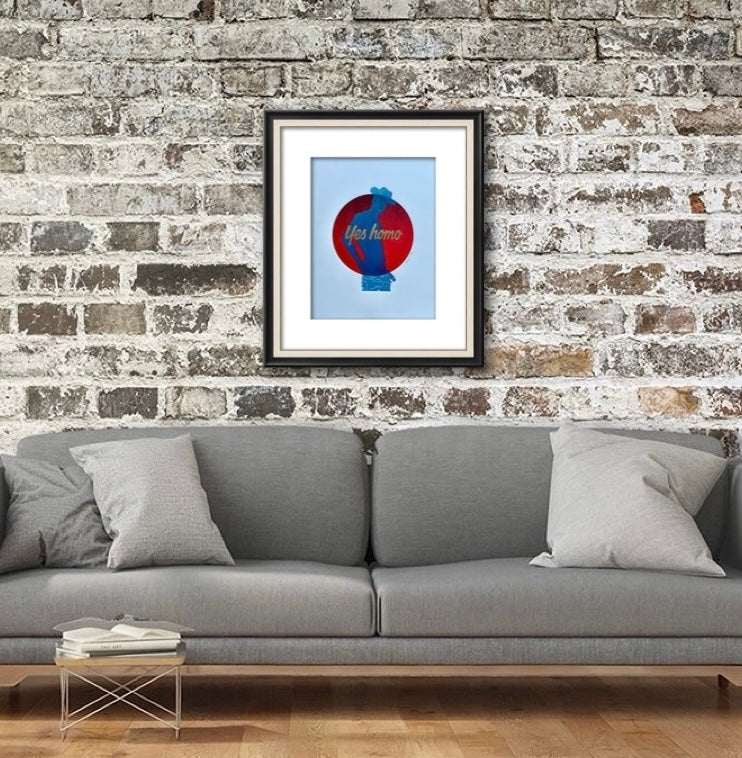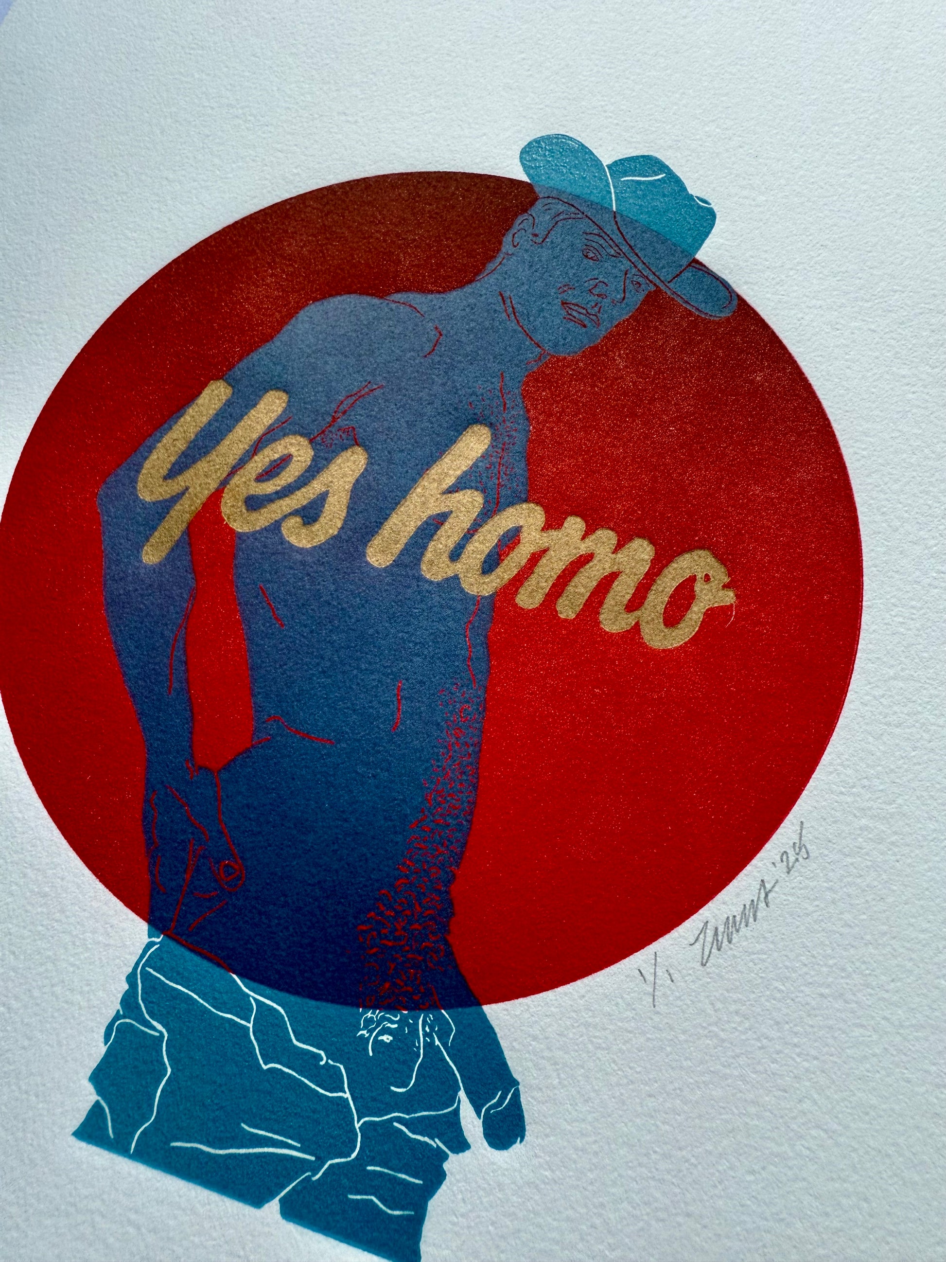 Three-layer loose print with gold, “Yes homo”, overlayed on a blue Cowboy figure, which sits on top of a red ombre circle. White paper.