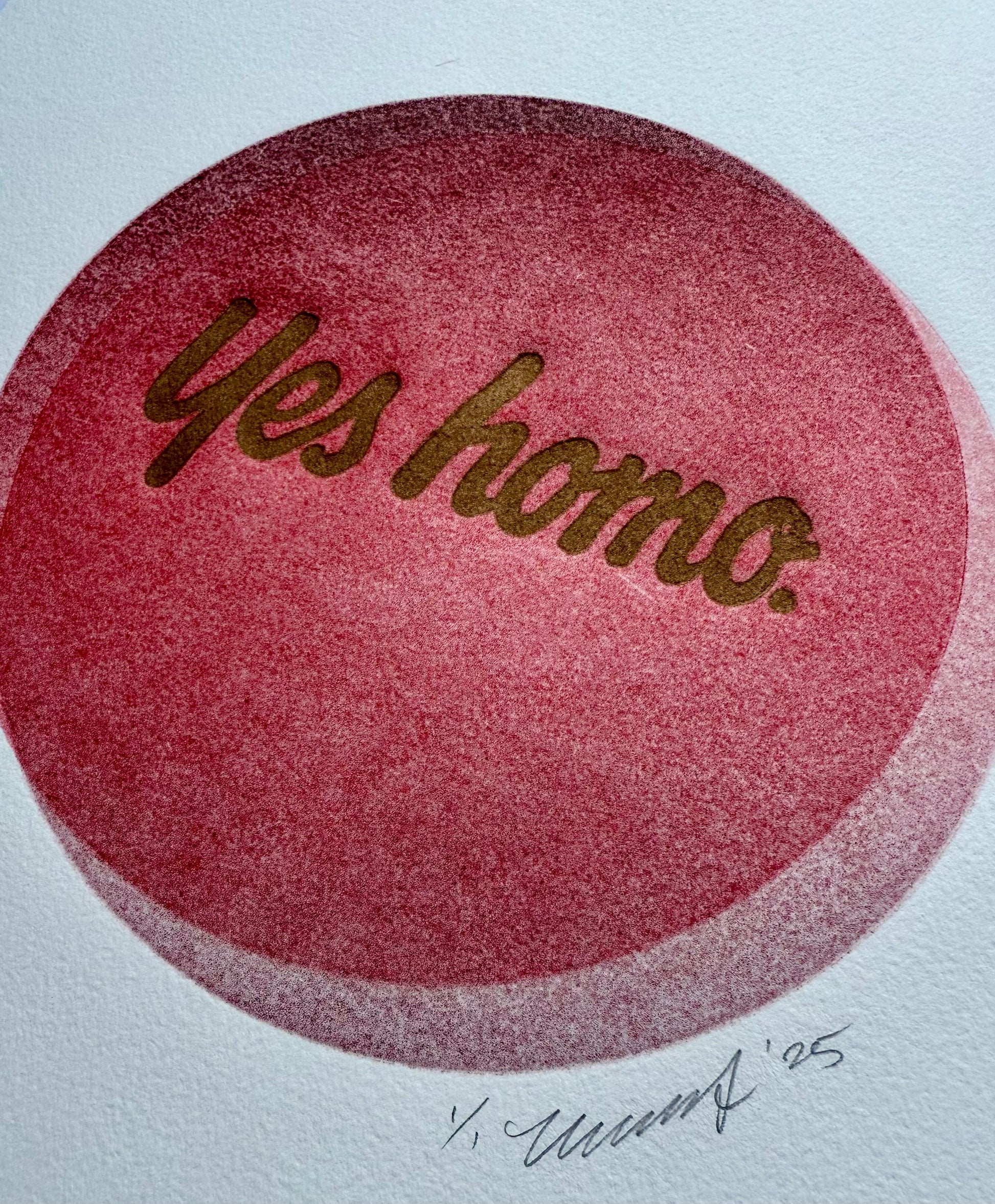 Three-layer loose print with “Yes Homo.” printed on top of two interlocking red circles. White paper. One-of-a-kind piece, signed as "1/1" — ‘one of one’.